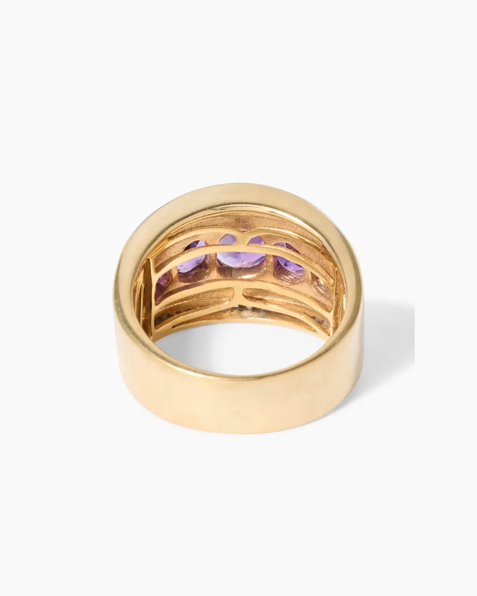 Ein Quintett aus runden Amethysten in kräftigem Violett dominiert den Ringkopf von diesem verlockenden Schmuckstück aus der neuen Harry Ivens Kollektion. Dabei sitzt der größte Amethyst genau im Zentrum in einer dezenten Zargenfassung, während die Steine links und rechts davon jeweils ein bisschen kleiner werden. Ergänzt wird die Amethyst-Parade durch 36 kleine, weiße Zirkone, die ober- und unterhalb davon in kleine Krappen gefasst sind. Der Ring aus hochwertigem Sterlingsilber 925 ist gelbvergoldet und hochglanzpoliert. Dadurch erhält er die Optik von echtem Goldschmuck, was ihn noch hochwertiger wirken lässt.