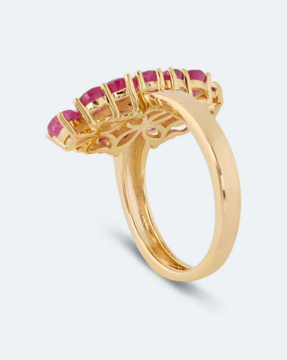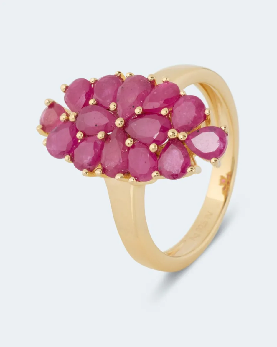 Mit diesem Edelsteinring aus gelbvergoldetem Silber 925 ziehen Sie alle Blicke auf sich. Der Ringkopf ist mit 14 Rubin-Tropfen ausgefasst, die dank des Facettenschliffs in allen feurigen Rottönen erstrahlen. Ein Eyecatcher der Extraklasse, der jede Ihrer Gesten stilvoll untermalt. Der Rubin gehört zu den schönsten Edelsteinen überhaupt und wird seit jeher gerne für außergewöhnliche Schmuckstücke verwendet.