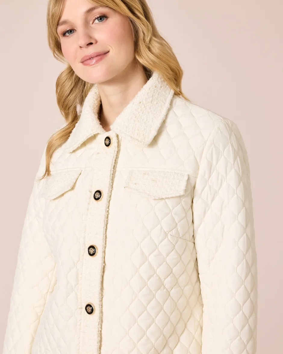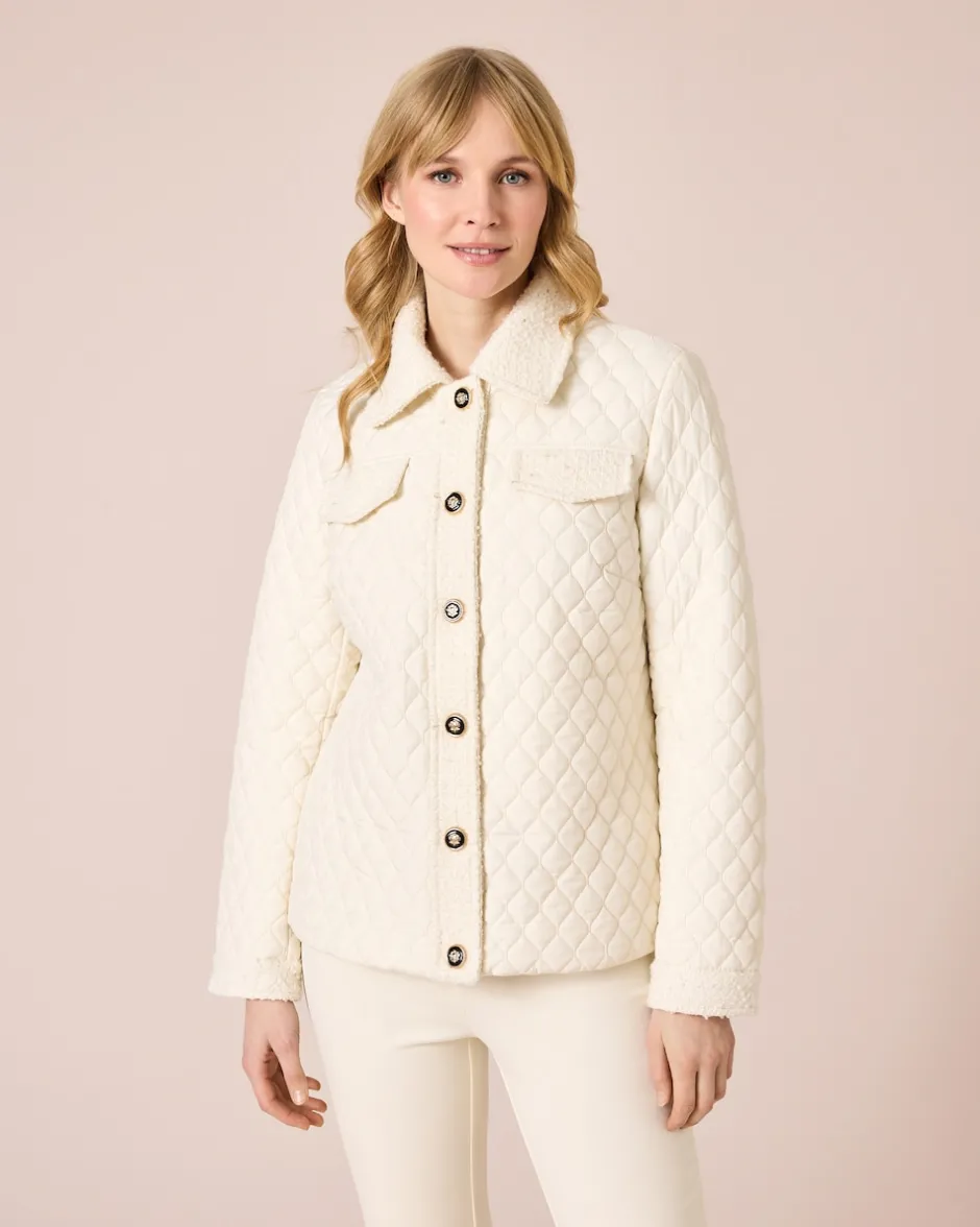 Die Alfredo Pauly Jacke kombiniert lässigen Stepp mit elegantem Bouclé. Das Ergebnis ist ein urbaner Fashion-Partner, den Sie im Alltag und im Büro tragen können. Die Jacke mit Liegekragen und aufgesetzten Patten auf der Brust wird mit Druckknöpfen geschlossen. Kragen, Knopfleiste und Ärmelbündchen sind mit Bouclé besetzt. In der zeitlosen Farbe Creme lässt sich die Steppjacke vielseitig kombinieren. Definitiv ein Must-have für Ihre Garderobe.