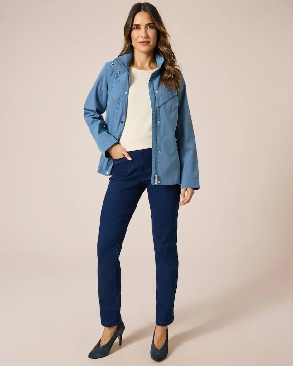 Die vielseitige Übergangsjacke aus der aktuellen Kollektion von Helena Vera besticht durch ihren sportiven Charme und die tollen Trageeigenschaften. Ausgestattet mit einem coolen Stehkragen sowie Kapuze mit Kordelzug. Die Kapuze kann eingerollt und im Kragen verstaut werden. Modische Abnäher und der optisch streckende V-Einsatz auf der Vorderseite sorgen für einen jungen und sehr femininen Auftritt. Der versteckte 2-Wege-Reißverschluss und die Druckknopfleiste halten die Körperwärme im Inneren der Jacke – auch wenn der Winter zwischendurch nochmals vorbeischaut. Insgesamt eine ebenso funktionale wie stylische Outdoor-Jacke, die Sie ebenso gut zum Sport wie zum Window-Shopping tragen können. In zwei trendigen Farben zur Wahl.