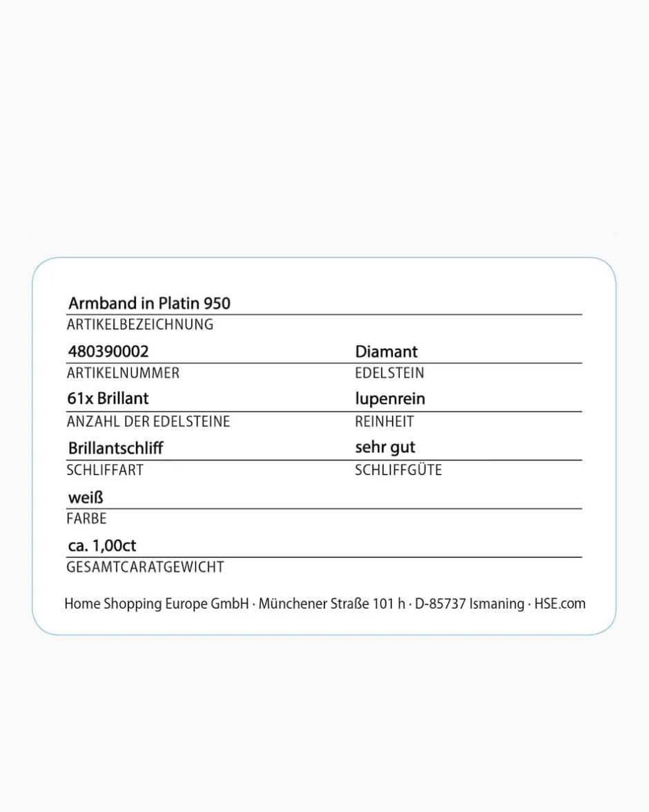 Diamanten: | Armbandlänge 19 cm: 68x Brillant, weiß Armbandlänge 17 cm: 61x Brillant, weiß | |