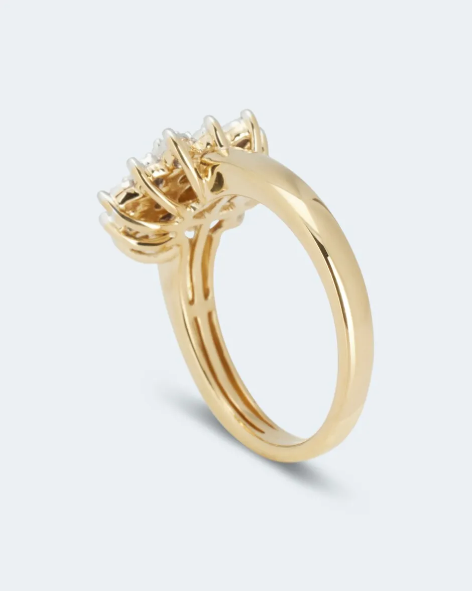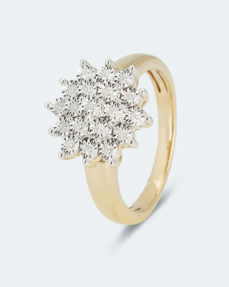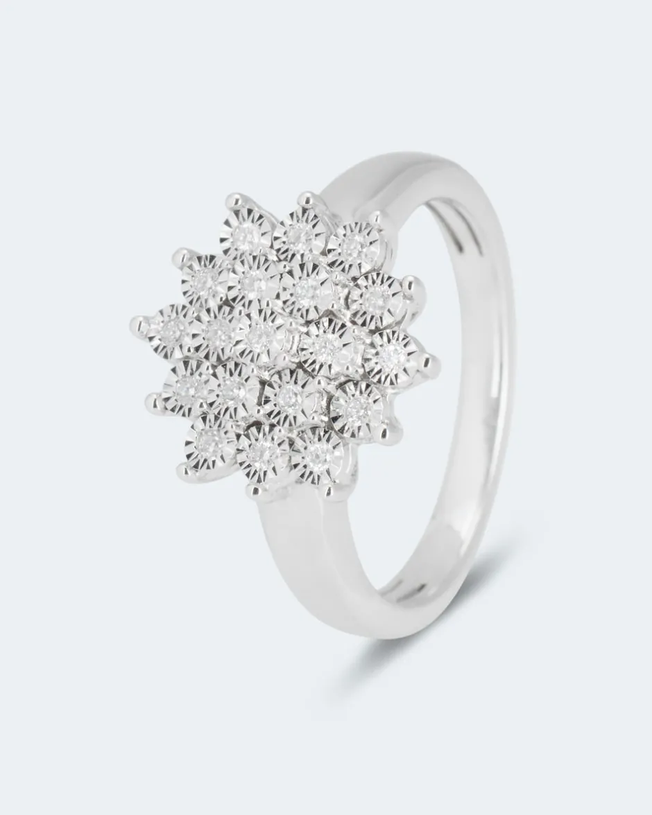 Wie eine Schneeflocke aus 19 Brillanten. Der zarte Ring aus 925er Sterlingsilber präsentiert auf dem Ringkopf 19 weiße Brillanten in der Reinheit P1 und von guter Schliffqualität. Die runden Brillanten sind im Brillantschliff veredelt und glitzern und funkeln bei jeder Ihrer Gesten spektakulär. Das Silber ist je nach Ihrer Vorliebe rhodiniert, also silberweiß oder gelbgoldplattiert mit warmem Goldschimmer. Beide Varianten sind hochglanzpoliert und harmonieren perfekt mit dem Glanz der Brillanten.
