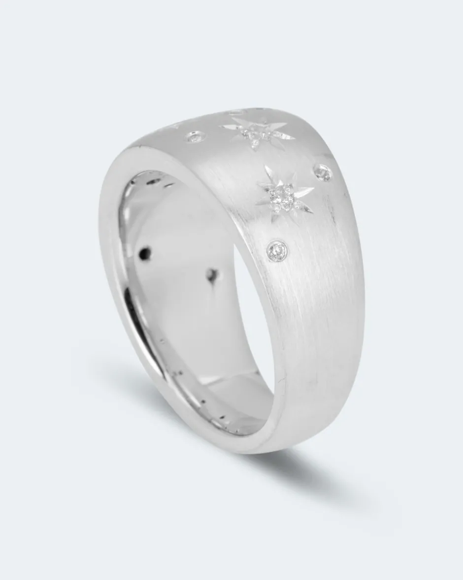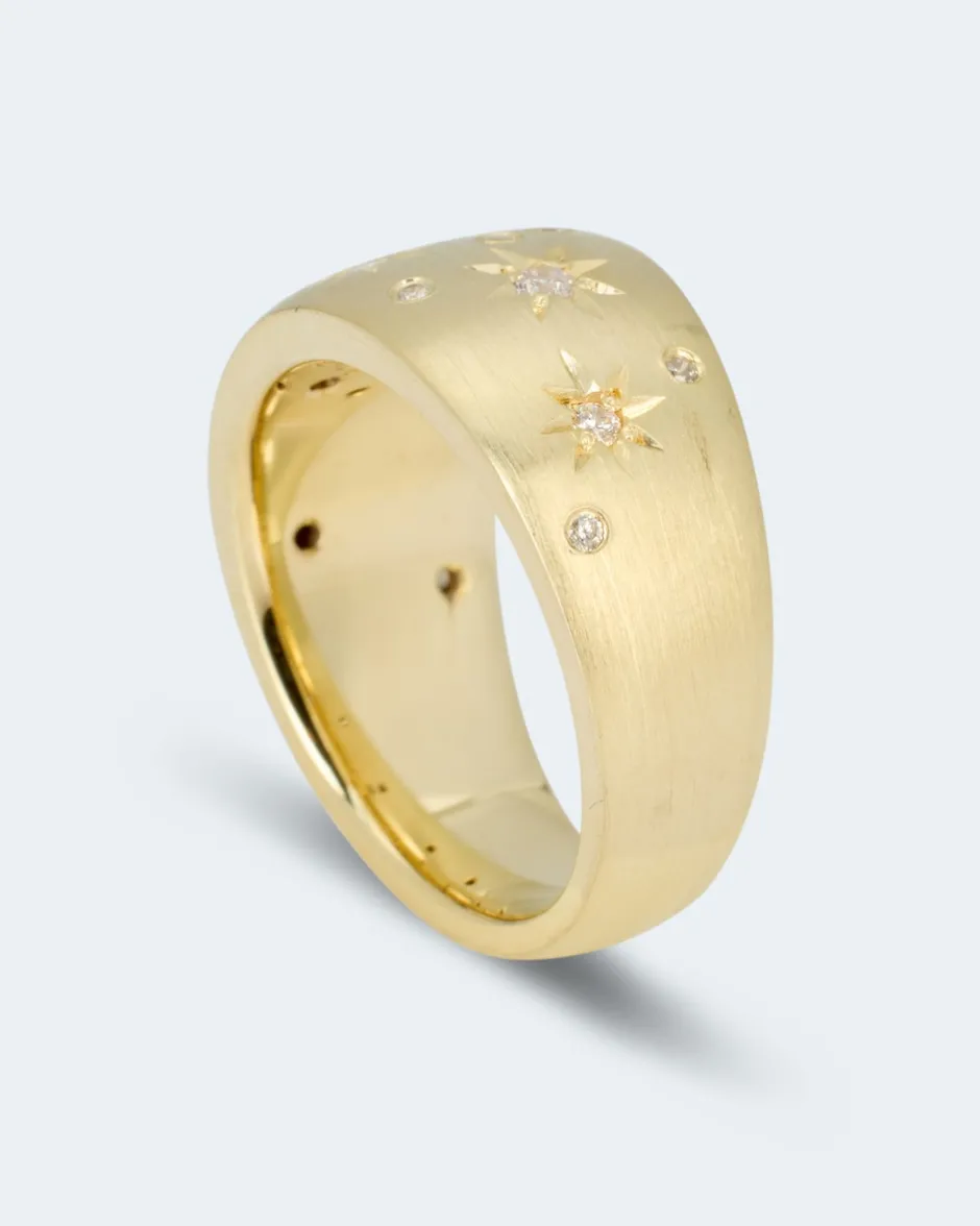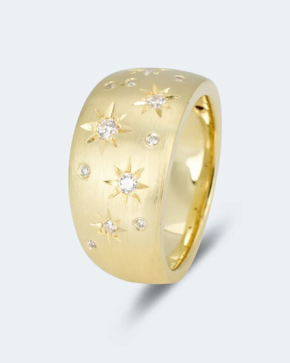 Dieser Ring aus glänzendem 585er Gelb- oder Weißgold funkelt wie ein Sternenhimmel an Ihrer Hand. Feurige Brillanten im Brillantschliff und in der Reinheit SI sind hier in die modisch breite Ringschiene eingerieben. Um die Brillanten herum sind kleine Sterne und Kreise eingraviert und setzen die 15 weißen Funkler so zauberhaft in Szene. Ob Sie sich für mattiertes Gelb- oder Weißgold entscheiden, die Magie der Brillanten bleibt immer die gleiche. Lassen Sie sich verführen.