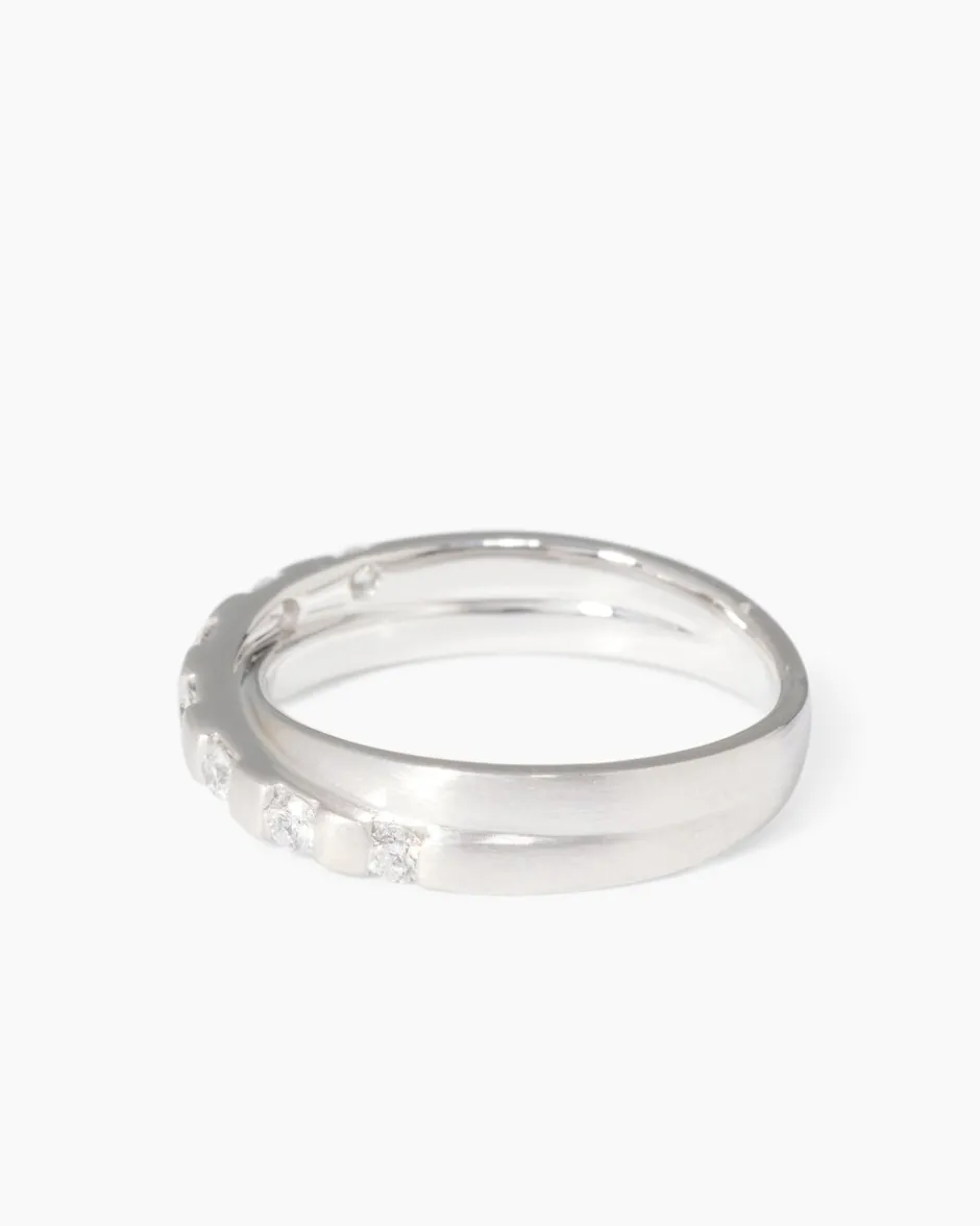 Dieser Ring überzeugt mit einem raffinierten Design aus hochglanzpoliertem und mattiertem Platin 600. Die Ringschiene ist zweigeteilt und überkreuzt sich am Ringkopf. Zusätzlich ist eine der Ringschienen mit sieben weißen Brillanten verziert. Die runden Brillanten in P1-Reinheit sind im Brillantschliff veredelt und verströmen aufregende Glitzerreflexe. Die Brillanten aus Kanada sind von sehr guter Schliffgüte und sitzen in wertvollen Teilzargenfassungen. Das kühl-elegante und kostbare Platin harmoniert perfekt mit dem wilden Funkeln der Brillanten. Dieser Ring zaubert Ihnen, wann immer Sie ihn tragen ein Lächeln ins Gesicht.