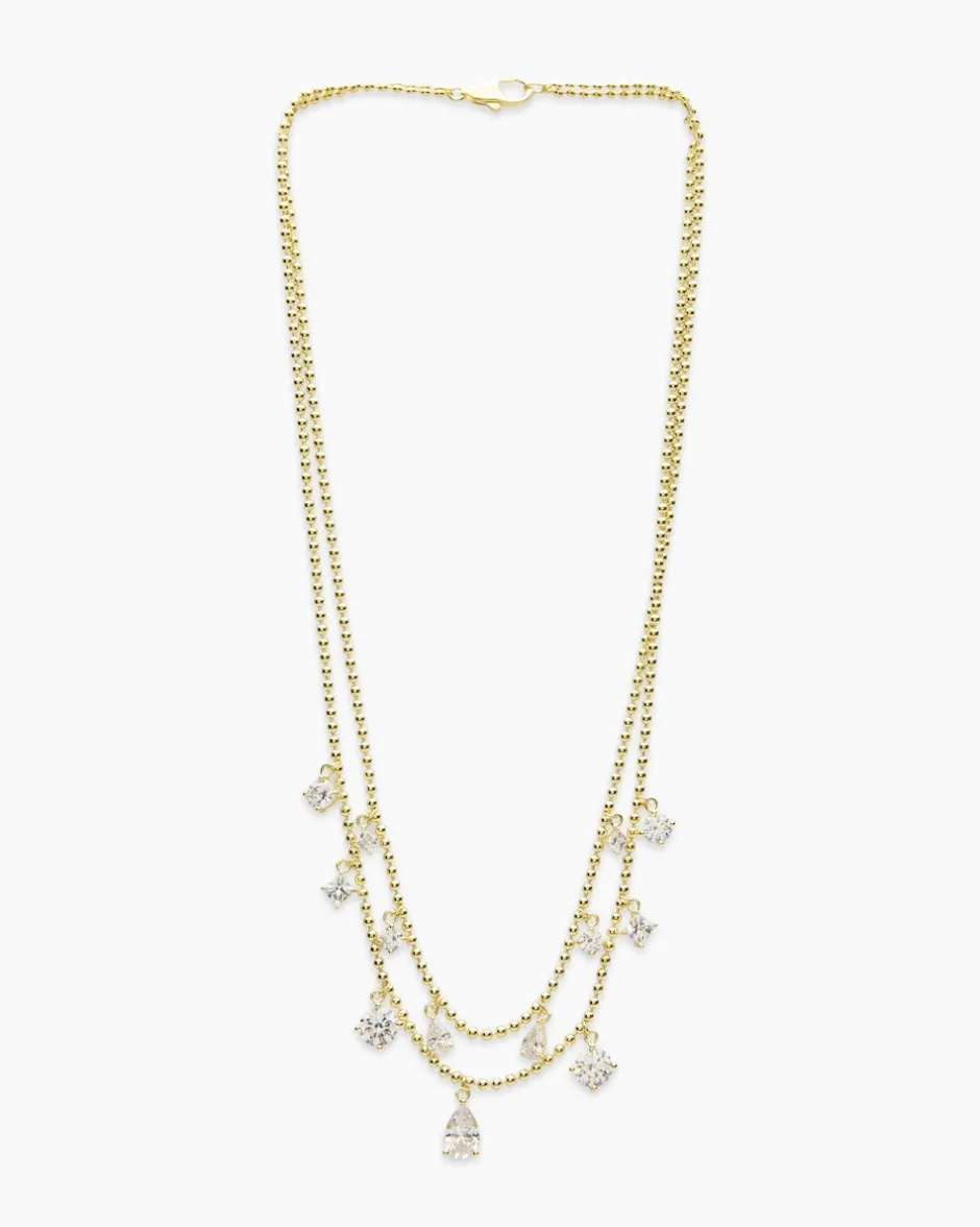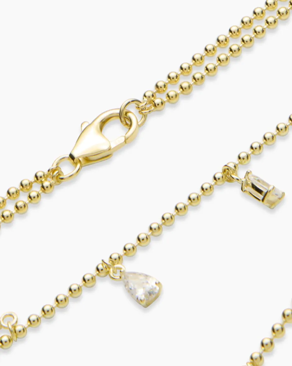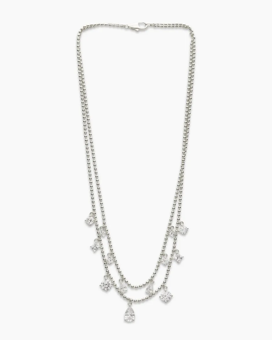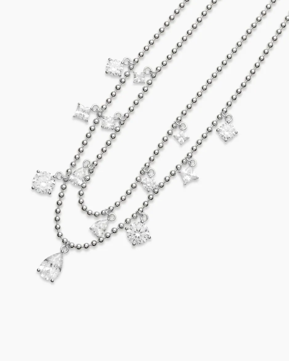 Veredeln Sie Ihren Look mit diesem majestätischen zweireihigen Collier. Der ausdrucksstarke Halsschmuck ist zweireihig gearbeitet mit fünfzehn funkelnden Zirkonia besetzt. Die Glitzersteine sind in verschiedenen Formen und Größen facettiert und werden in Krappen gehalten. Die Zirkonia sehen echten Brillanten zum Verwechseln ähnlich. Entscheiden Sie sich für den kühlen Weiß- oder warmen Gelbgold-Look – je nachdem, ob Sie lieber Silber- oder Goldschmuck tragen. Mit einer Länge von ca. 42 Zentimeter und dem praktischen Karabiner ist dieses Collier ein echter Magnet für die Blicke und definitiv ein Update für Ihre Festtagsgarderobe.