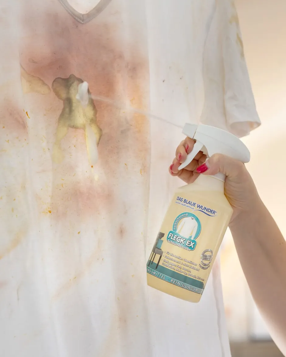 Anwendung: | Kindersicherheitsverschluss nach unten drücken und drehen, Spritzeinsatz entfernen und Sprühkopf aufschrauben. Bei Flecken auf Polstern, Teppichen usw.: Schaum auf die Flecken geben, warten bis sich der Schaum aufgelöst hat, mit feuchtem Tuch gelösten Schmutz aus dem Gewebe reiben, mit trockenem Tuch nachreiben. Als Vorwaschspray: Schaum auf den Fleck sprühen, warten bis sich der Schaum tief im Gewebe verteilt hat, in die Waschmaschine geben und bei gewünschter Gradzahl mit Waschmittel waschen. Als Schaumreiniger gegen Verschmutzungen in Küche, Bad und Werkstatt: Schaum auf die Fläche sprühen, bei Bedarf etwas einwirken lassen, mit feuchtem Tuch gelösten Schmutz aufnehmen. |