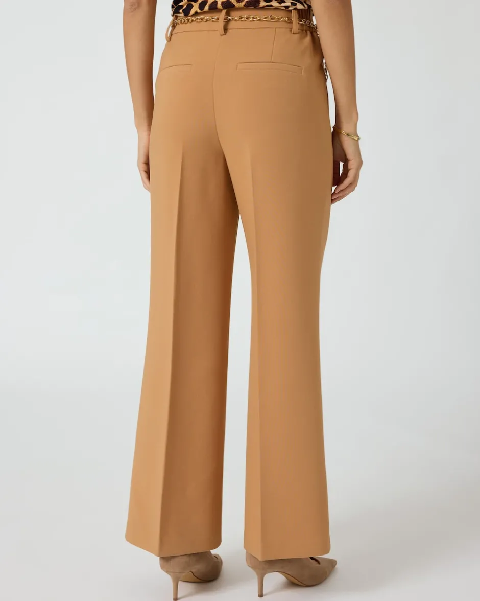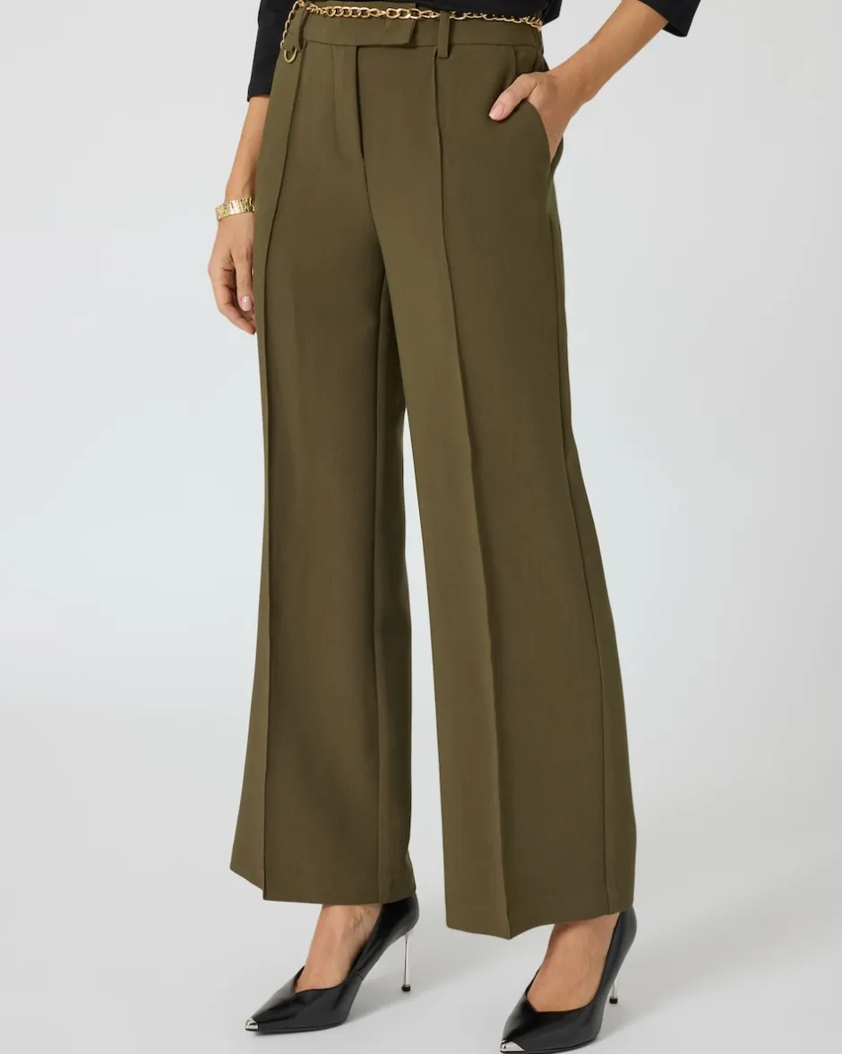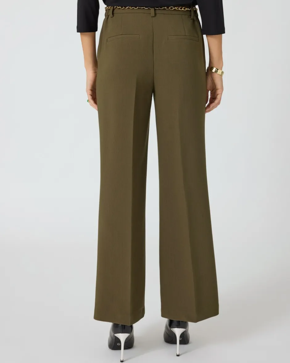 Sie suchen eine Hose, die sowohl schick als auch bequem ist? Unsere Hose im eleganten Look mit Teildehnbund und Gürtelschlaufen wird Sie begeistern. Ein dekorativer Kettengürtel und eine Dekoschlaufe mit Metallring am Bund setzen modische Akzente. Seitliche Eingriffstaschen sorgen für praktischen Stauraum, während das weite Bein mit Biese vorne einen fließenden Fall zaubert. Der Reißverschluss mit Häkchenverschluss unterstreichen die elegante Linie der Hose. Ob kombiniert mit einer schicken Bluse und Pumps für das Büro oder mit einem legeren Top und Sandalen für ein Sommerfest – diese Hose passt zu jedem Anlass und kleidet Sie stilvoll und komfortabel.