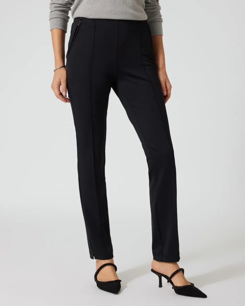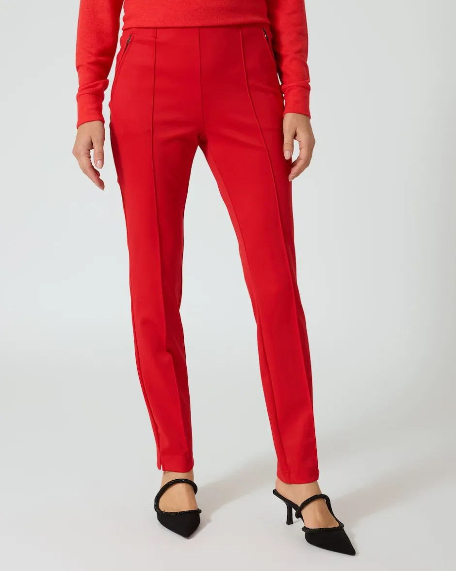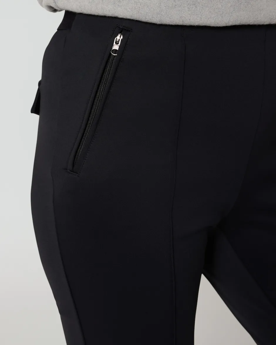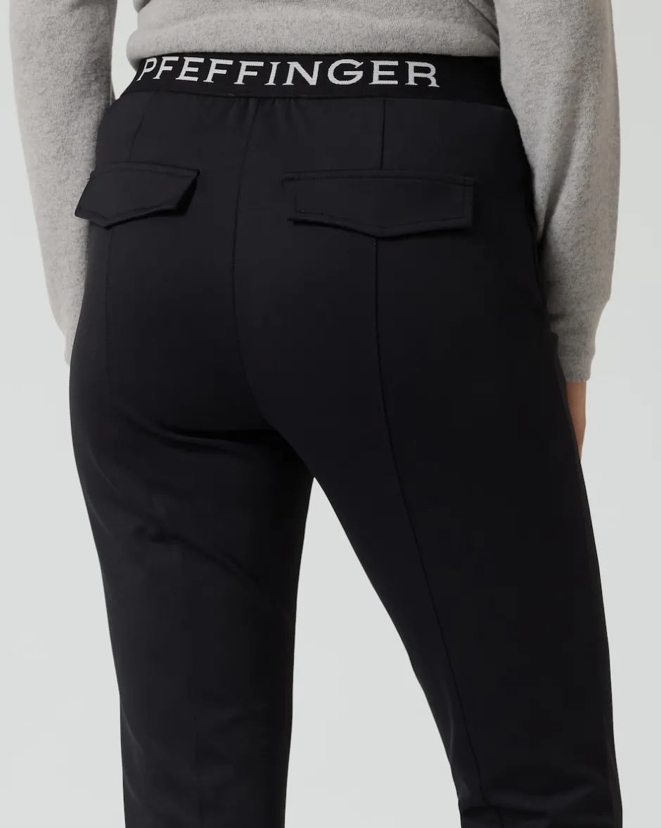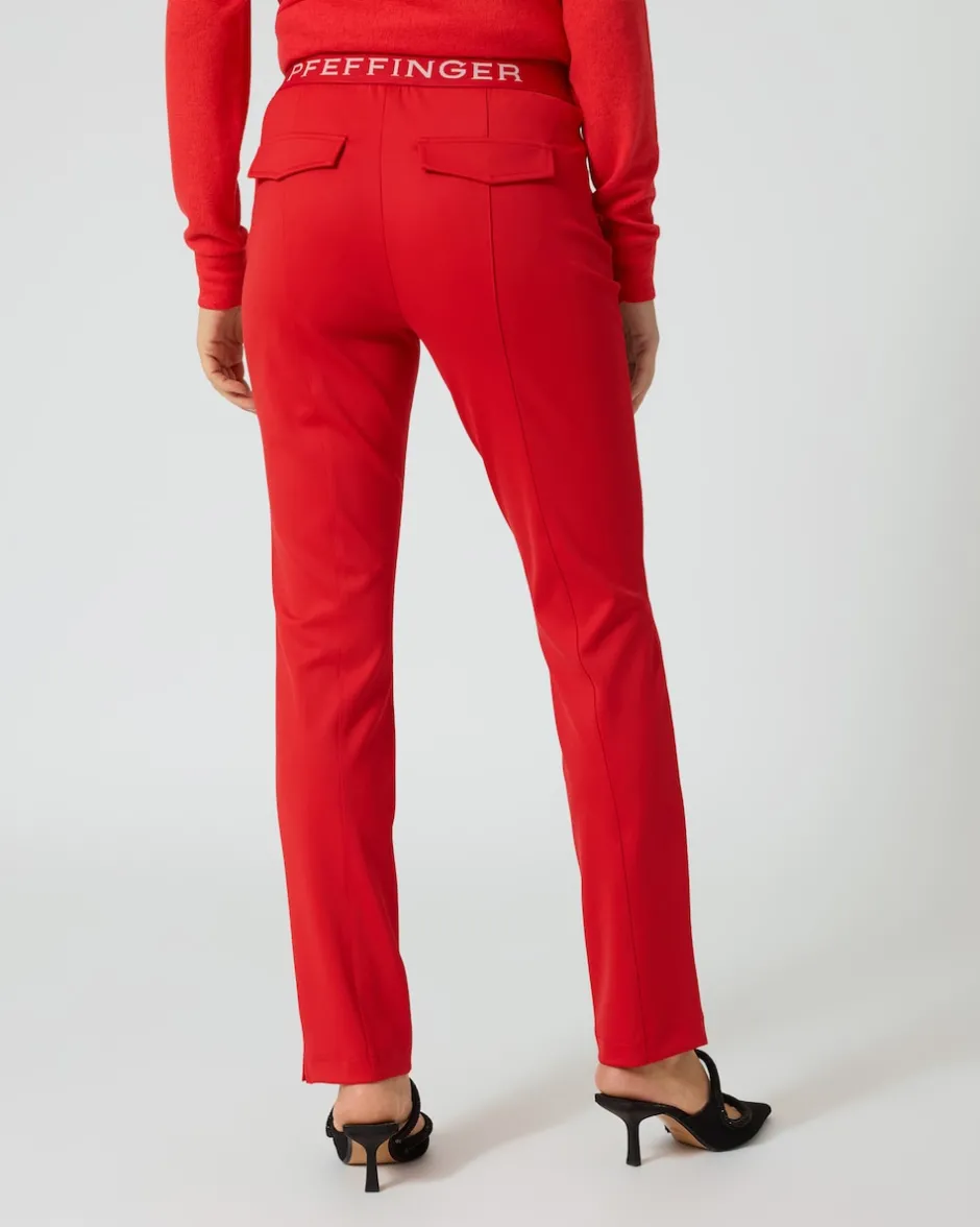 Mit der Pfeffinger Hose erhalten Sie einen schmeichelnden Kombipartner, der Ihre eleganten Business-Looks ebenso komplett macht wie ein lässiges Freizeit-Outfit. Besonders von hinten hat die Hose ihre Reize: Der Gummizug ist dort mit einem prominenten Logo-Schriftzug verziert und die Fake-Gesäßtaschen mit aufgesetzten Patten formen einen schönen Po. Auf der Vorderseite sorgen optisch streckende Biesen und schräge Einschubtaschen mit Reißverschlüssen für eine moderne Optik. Ein kleiner Saumschlitz gibt den Blick frei auf die Schuhe, die Sie zu Ihrer neuen Hose kombinieren.