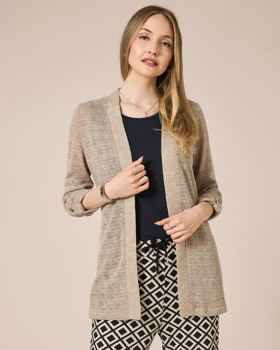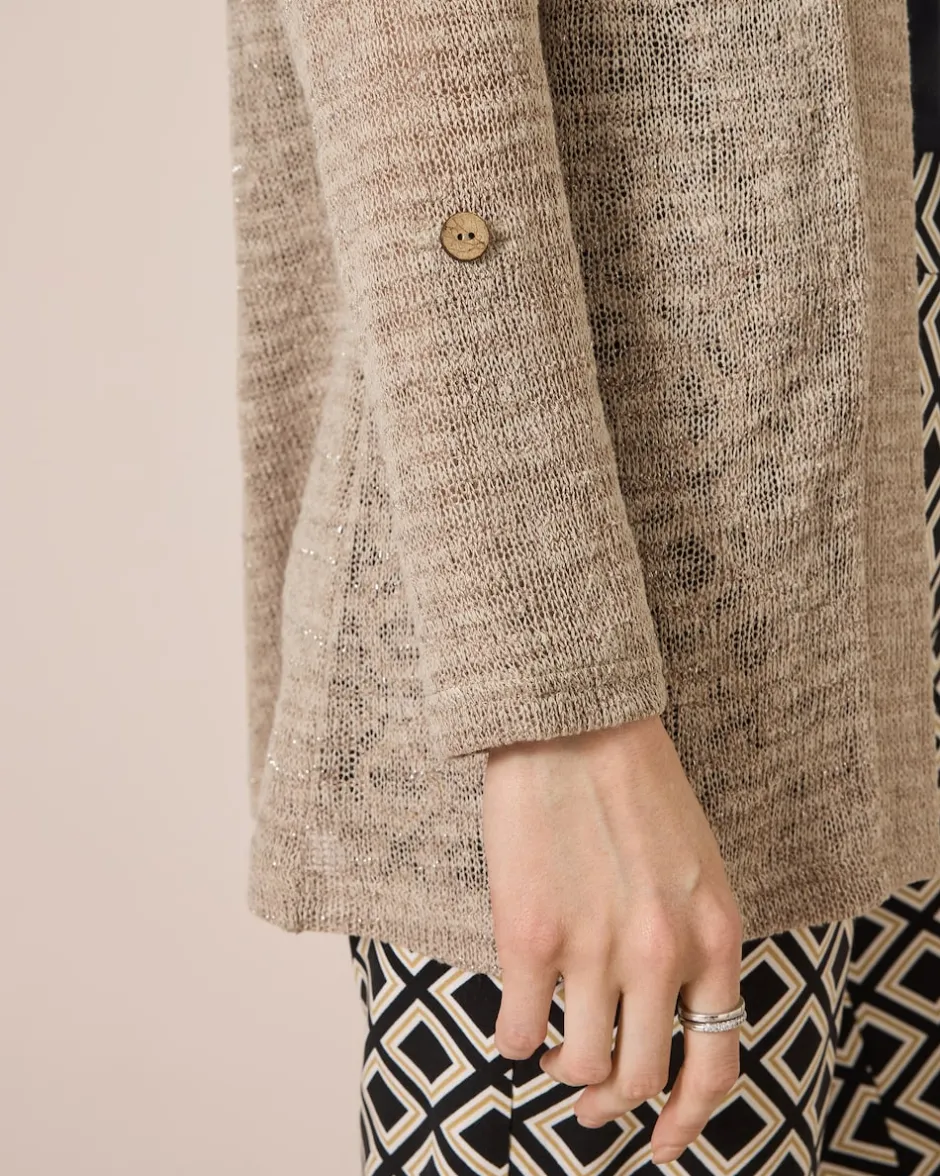 Dieser Longcardigan aus feinem Strick ist so chic, dass er auch zu stilvollen Office-Outfits getragen werden kann. Die elegante Qualität ist mit glitzerndem Metallgarn verarbeitet und in drei modischen Farben erhältlich. Hübsches Detail: Durch die Knopfriegel am Armabschluss können die Ärmel lang oder in ¾-Länge getragen werden. Freuen Sie sich auf einen vielseitigen Kombipartner für die wärmere Jahreshälfte.