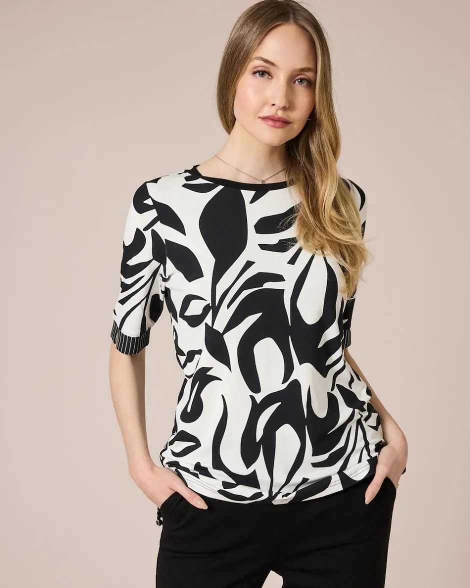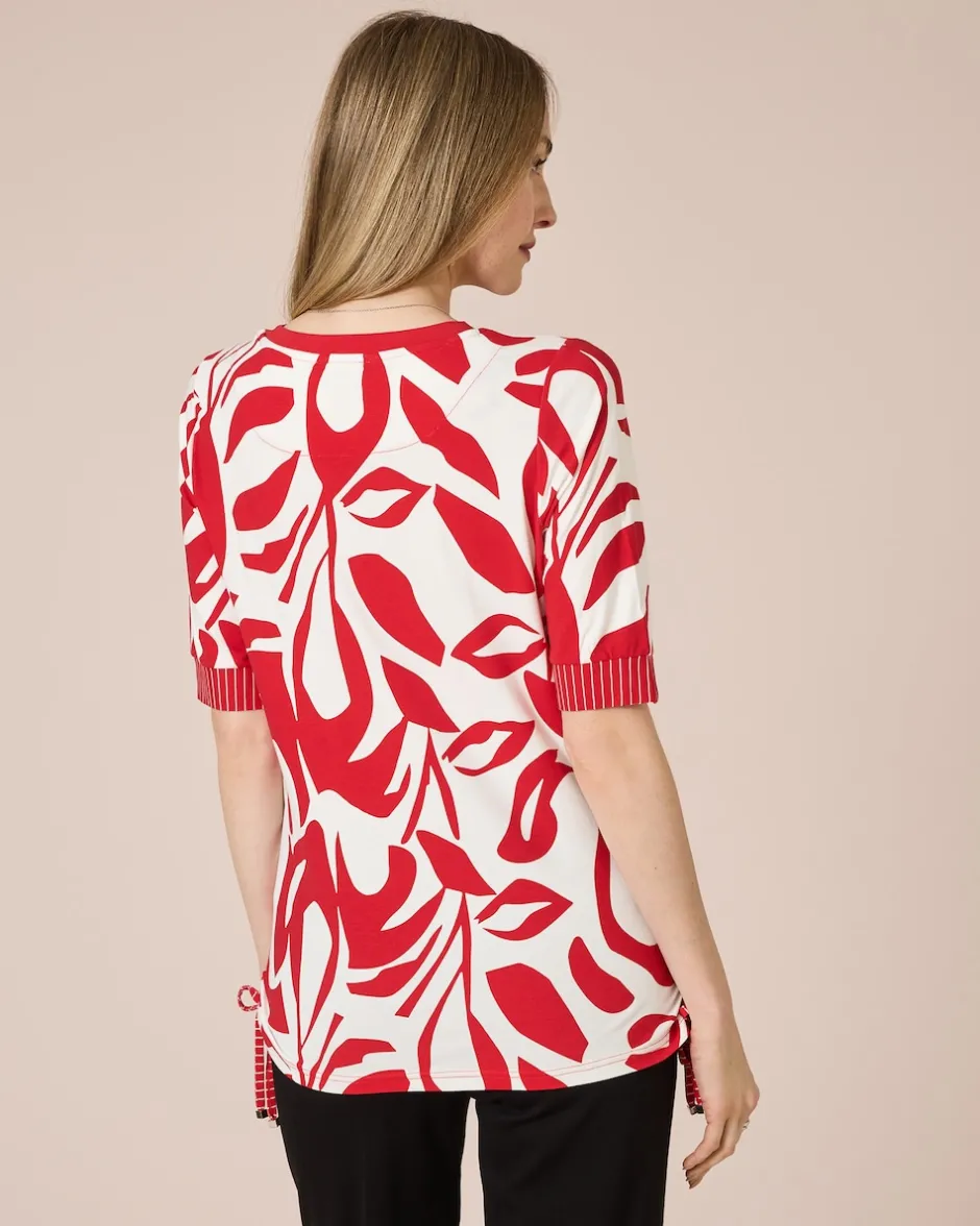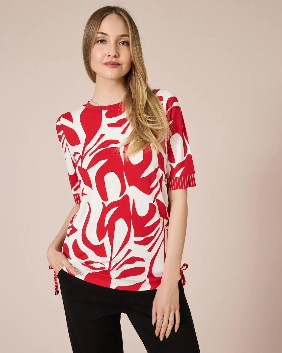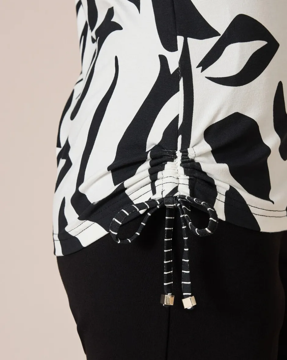 Ein Sommershirt mit großem Kombitalent aus der neuen Helena Vera Kollektion erwartet Sie hier. Das Shirt ist allover mit einem modernen, stilisierten Blätterdruck in Bicolor-Optik gestaltet. Seitlich ist es links und rechts mit einem raffinierten Kordelzug ausgestattet, so können Sie die Länge zu variieren. Dank der großzügigen Länge und der taillierten Schnittführung zaubert das Midi-Shirt zudem eine schöne feminine Figur. Unwiderstehlich ist auch der tolle Tragekomfort, bedingt durch die erstklassige Materialqualität: Das Shirt ist aus Lenzing EcoVero™ Viskose gefertigt, einer nachhaltigen Faser, die gut für die Umwelt ist und so ein rundum gutes Gefühl vermittelt.