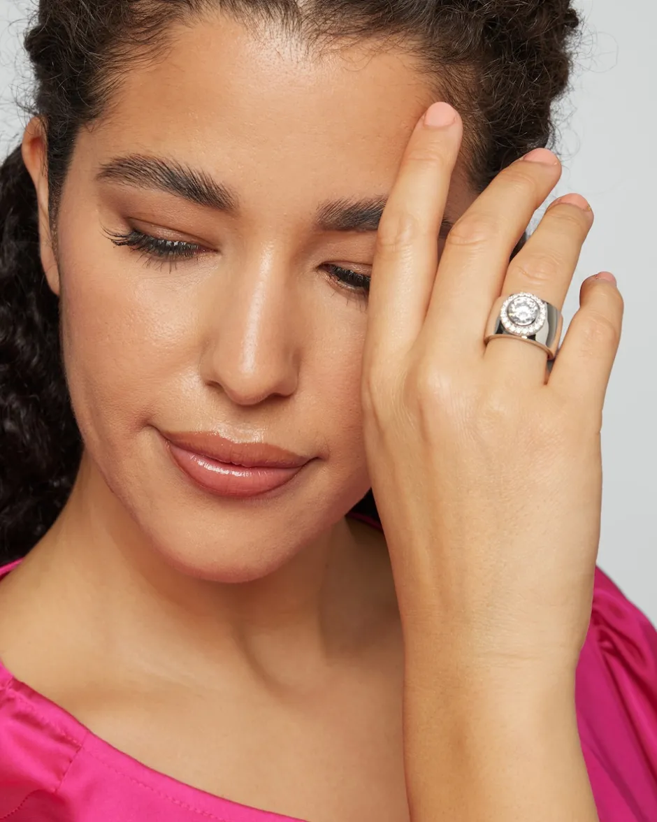 Alfredo Paulys Liebe zu opulenten femininen Designs ist auch in seinen Schmuckwaren sichtbar. Aus der Mitte dieses ausdrucksstarken Rings funkelt ein großer, aufwendig facettierter Zirkonia, umgeben von 20 kleineren Zirkonia-Steinen. Die Steine sitzen in einer extra-breiten Ringschiene, wahlweiße mit rhodiniertem oder gelbvergoldetem Finish. Ein hinreißendes Schmuck-Accessoire für jeden Tag.