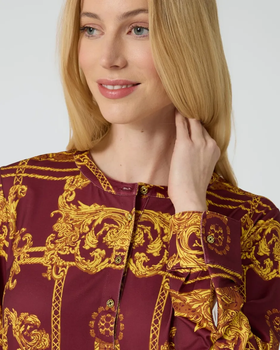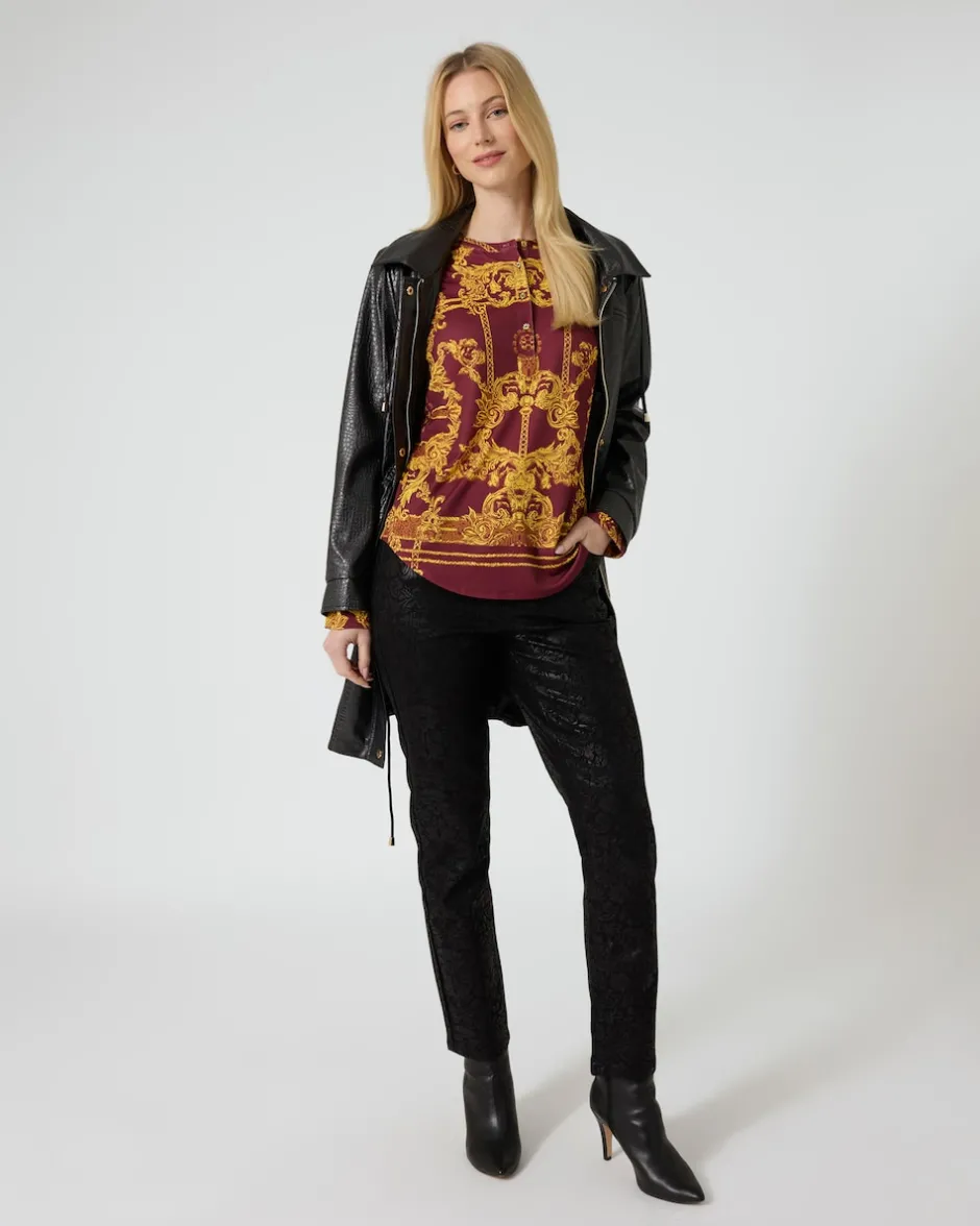 Die Tunika begeistert durch ihre designstarke Gestaltung mit einem goldfarbenen Allover-Ornamentdruck, der an royale Motive erinnert. Beim Hintergrund haben Sie die Wahl zwischen Creme und Burgund. Der freche Stehkragen öffnet sich mittig zu einer kurzen Knopfleiste mit kleinen Knöpfen in Gold. Figurumspielend und mit stark abgerundetem Saum geschneidert, lässt sich die Tunika optimal über der Hose tragen. Insgesamt ein durch und durch feminines Stück Mode für junge und dynamische Looks.