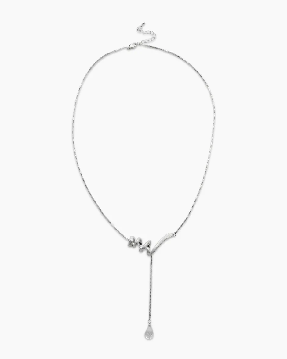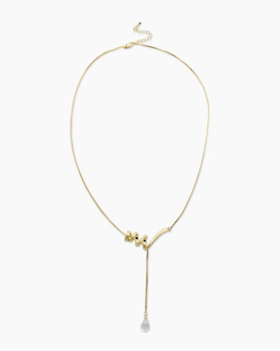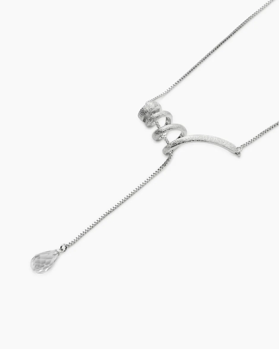 Dieses Collier besticht durch sein modernes und raffiniertes Design: Die mittige Spirale mit elegant gebürstetem Finish ist zugleich ein Slider. Damit lässt sich die Länge des Colliers nahtlos variieren, wodurch der Halsschmuck jedem Ausschnitt perfekt angepasst werden kann. Am unteren Ende der Kette funkelt zudem ein wunderschöner, facettierter Glasstein in Tropfenform. Das Grundmaterial Messing kann in gelbvergoldeter oder palladinierter Variante bestellt werden.