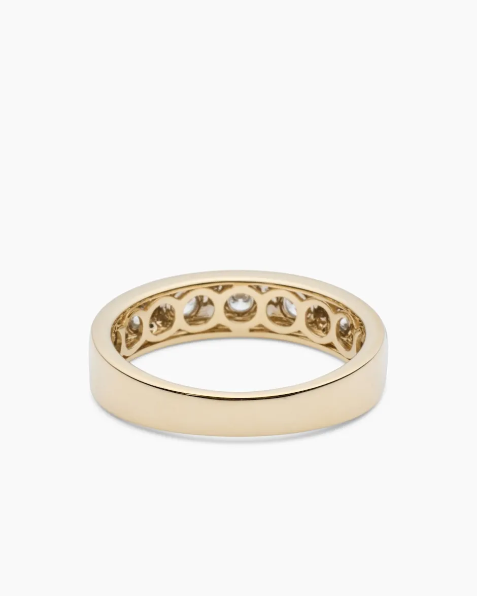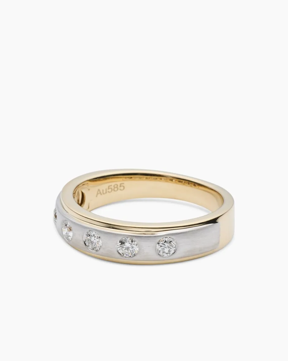 In diesem Ring ist das Feinste vom Feinen vereint: Die zweifarbige Ringschiene aus Gelbgold und Platin hält 5 beeindruckende Brillanten. Die Basis für den wertvollen Bandring ist das 585er Gelbgold. Dort, wo die Steine in Zargen gefasst sind, verschmilzt es mit einem weiß schimmernden Platinstreifen. Die einzigartigen Farben der Edelmetalle und das Funkeln der Steine kommen in dieser Komposition perfekt zur Geltung. Klarheit und Stil bestimmen das Design und sorgen dafür, dass jede Ihrer Gesten zum Blickfang wird.