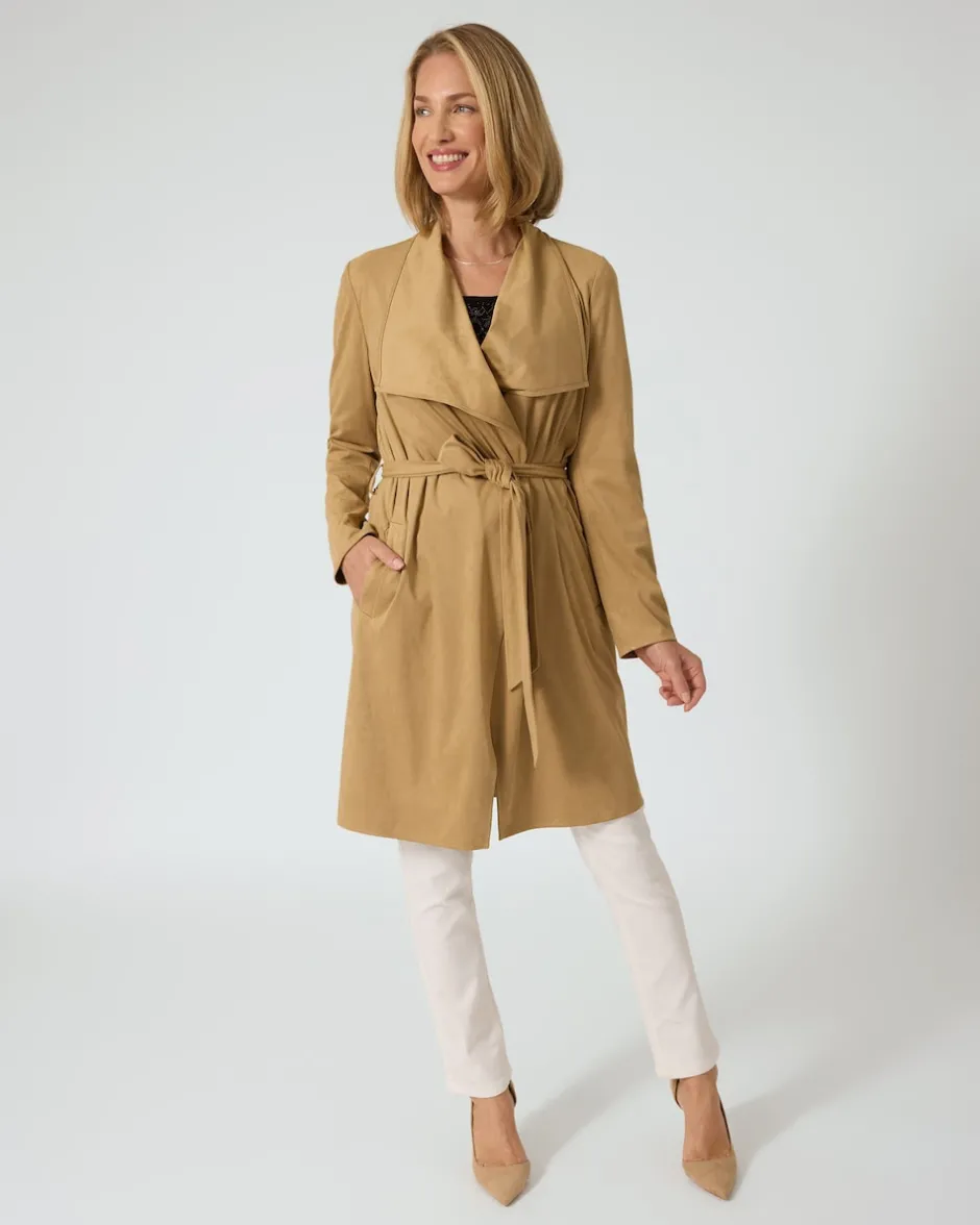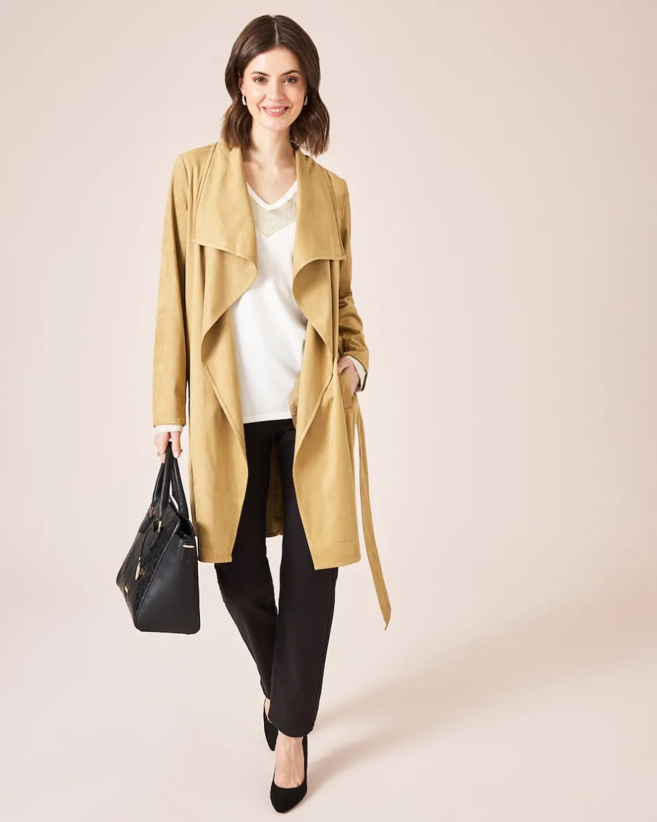 Mit diesem stylishen Mantel in aparter Velours-Optik wird Ihr Outfit komplett. Ein breiter, ausladender Reverskragen verleiht dem Mantel den betont femininen Style, ebenso der taillierende Bindegürtel. Ansonsten besticht der Style durch seine lässige Eleganz mit offener Form, Seitentaschen und Knielänge. Tragen Sie den Look zu eleganten Hosen und Röcken, aber auch zur relaxten Lieblingsjeans.