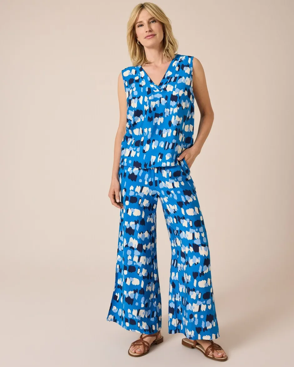 Das ärmellose Top entzückt durch sein designstarkes, sehr intensives und mehrfarbiges Allover-Fantasie-Muster mit einem Fokus auf Violett. Wunderbar feminin wirkt der V-Ausschnitt auf Vorder- und Rückseite. Kombinieren Sie zum Beispiel mit Jeansrock oder Bermuda und Flip-Flops – und schon steht Ihr lässiges Outfit für einen herrlichen Sommertag. Oder Sie bestellen die passende Hose im selben Design direkt dazu (474130).