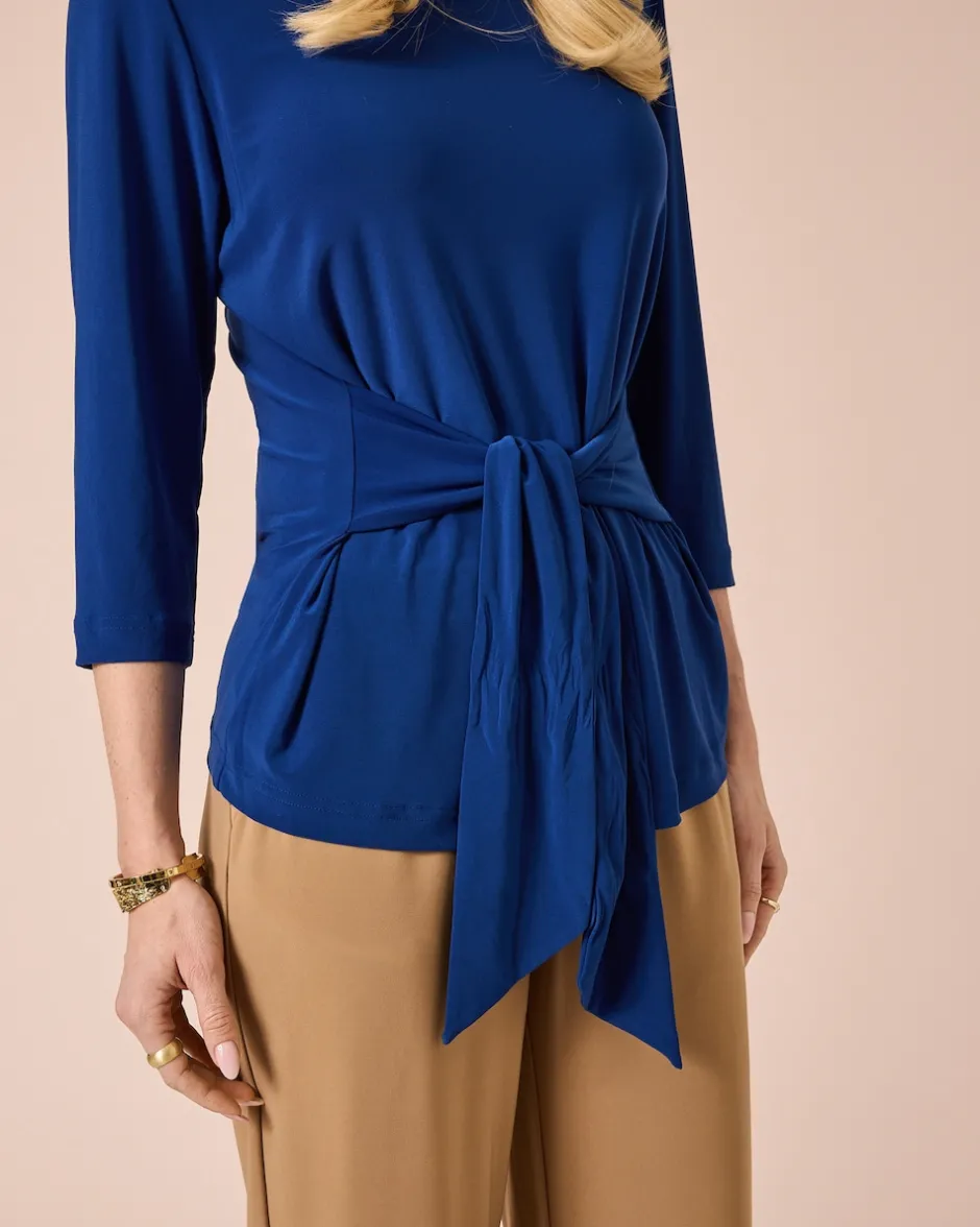 Hier kommt ein lässiger Alleskönner für jeden Anlass – und einfach zum Wohlfühlen. Das Shirt hat einen Bindegürtel in der Taille, mit dem Sie spielen und ausprobieren können. Der einfarbige Stoff lässt sich gut kombinieren, mit Hosen, Röcken und Accessoires. Zu den 3/4-Ärmeln kommt ein weiter Rundhals mit schmalem Saum. Der untere Saum ist gerade gehalten. Außerdem pflegeleicht und knitterarm – ein Must Have.