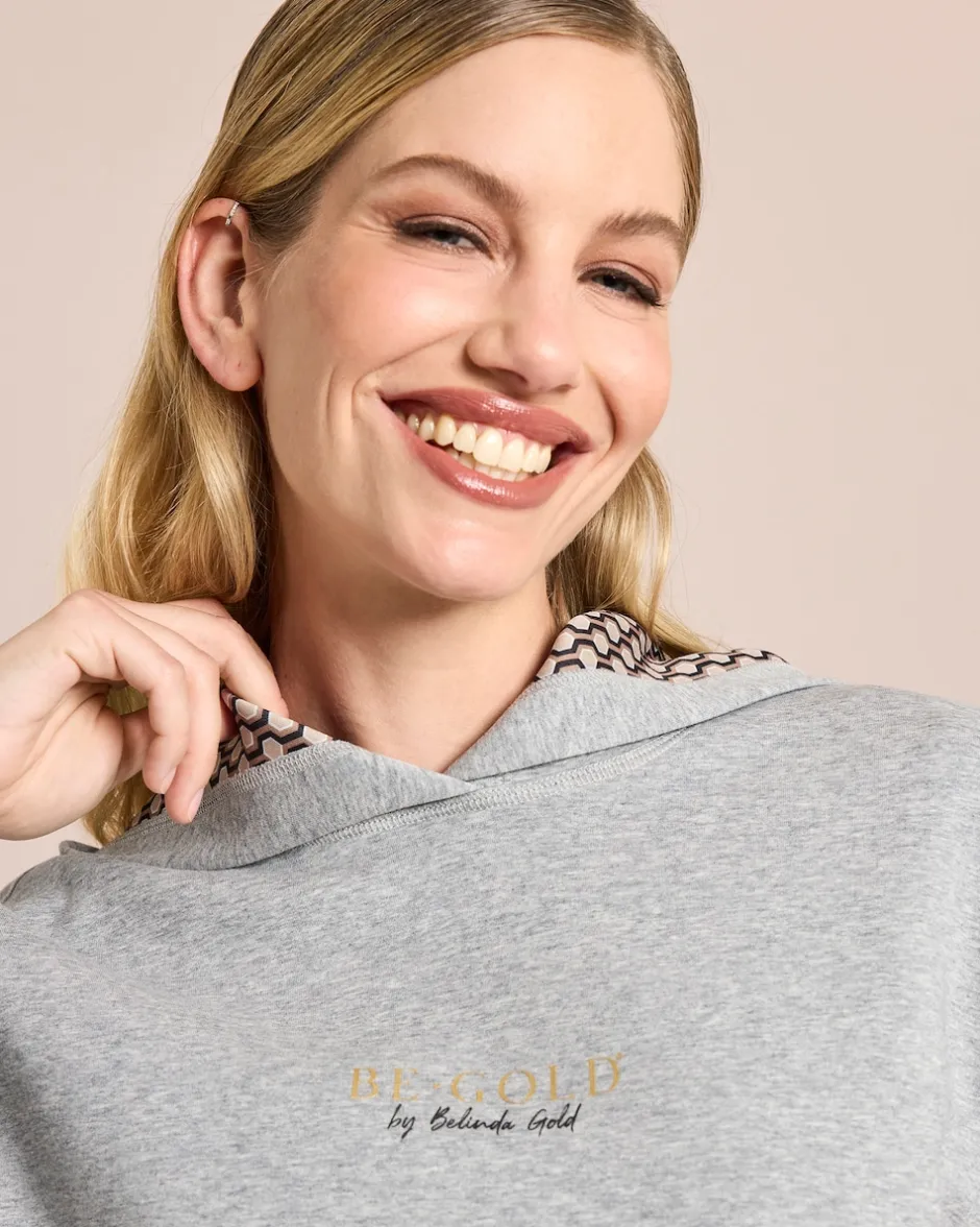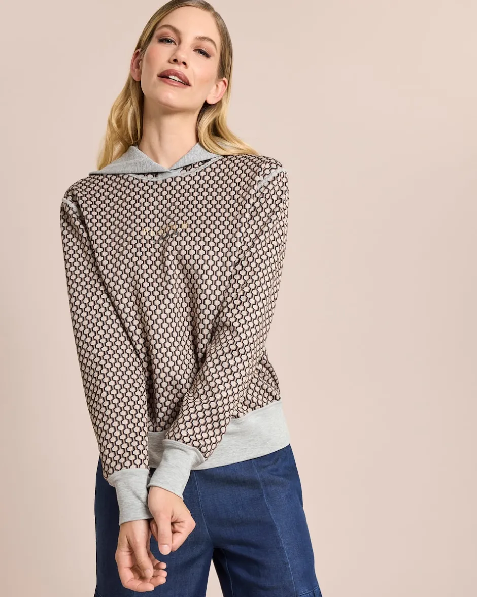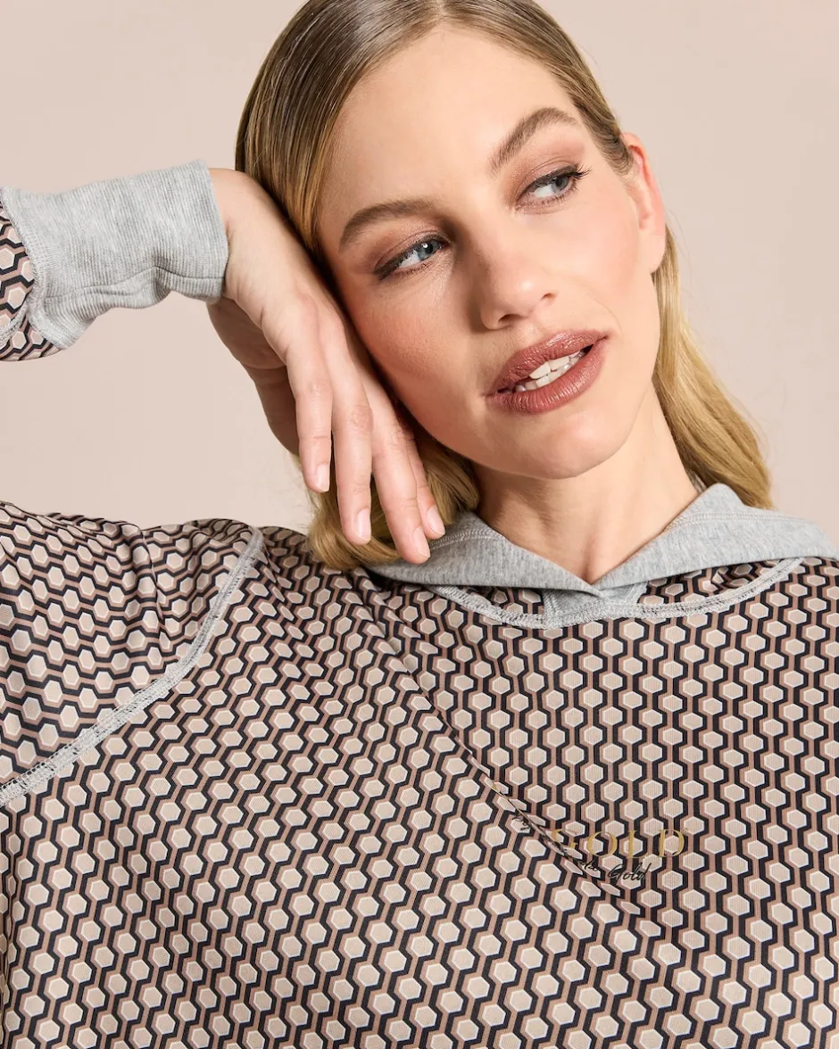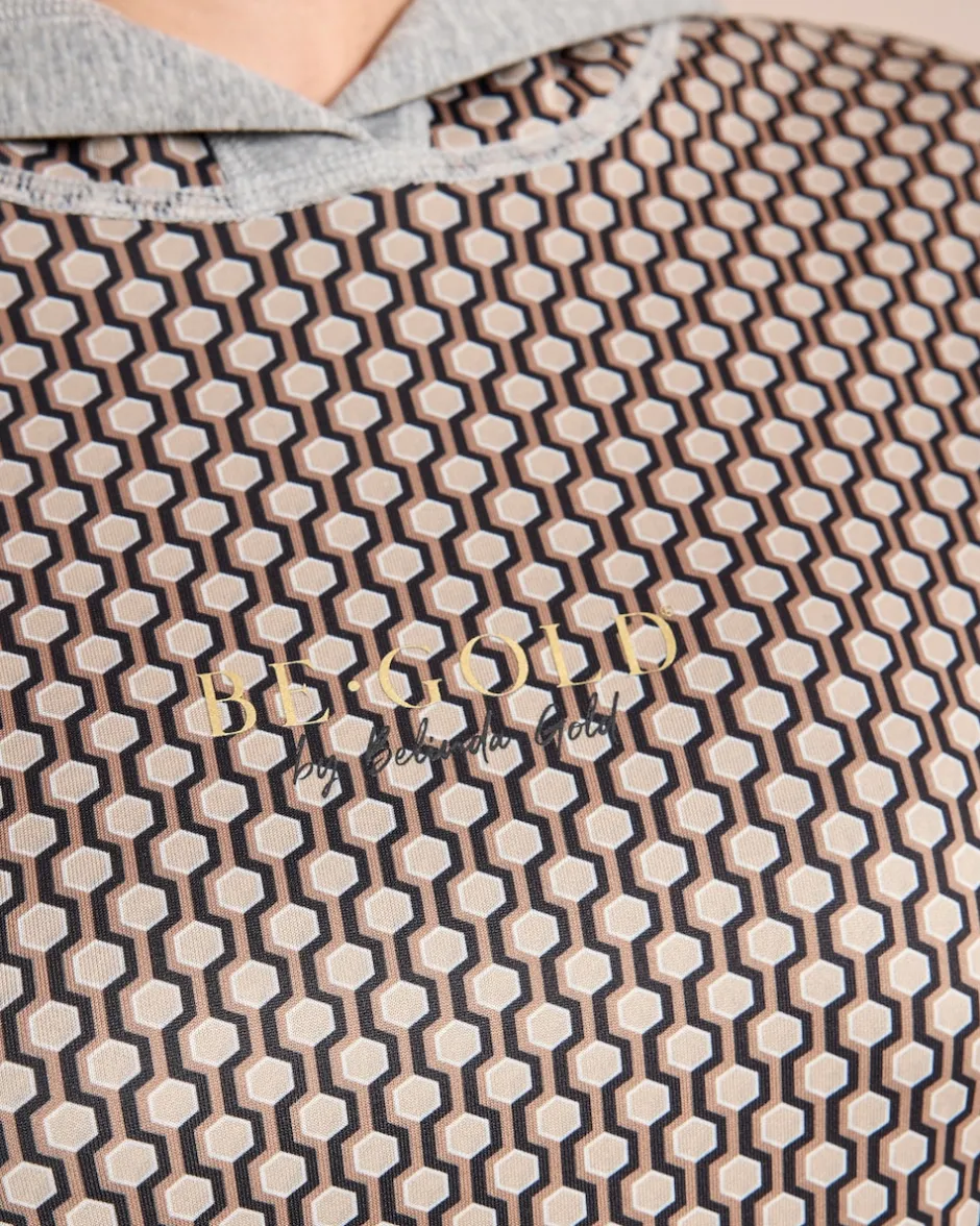Gleich zwei Looks in einem erhalten Sie mit diesem coolen Hoodie der Linie BE GOLD by Belinda Gold. Der bequeme Sweater ist im raffinierten Wende-Design gestaltet, sodass Sie neben der klassisch einfarbigen Optik auch eine gemusterte Variante tragen können. Die Qualität ist angenehm weich und enthält einen hohen Baumwollanteil. Ein vielseitiger und kombistarker Allrounder mit relaxtem Appeal.