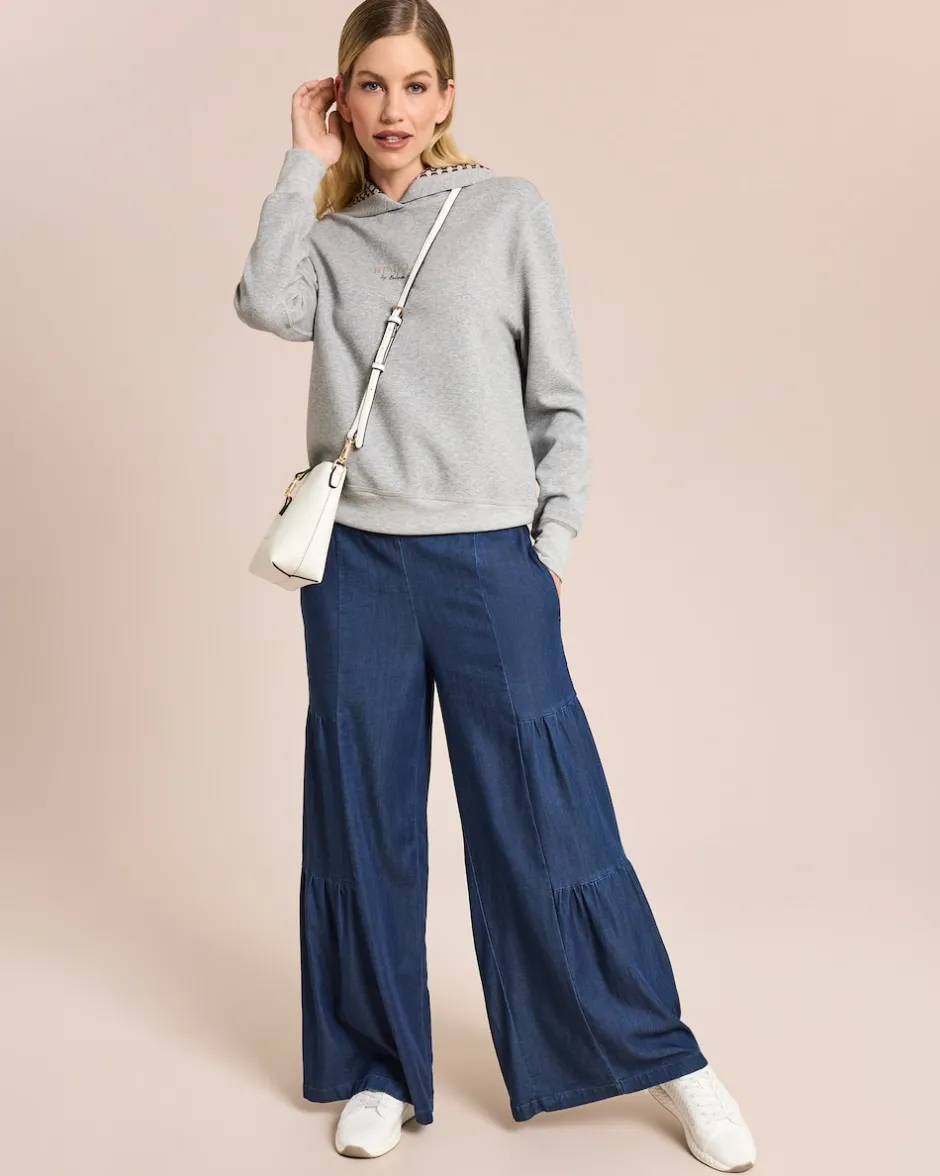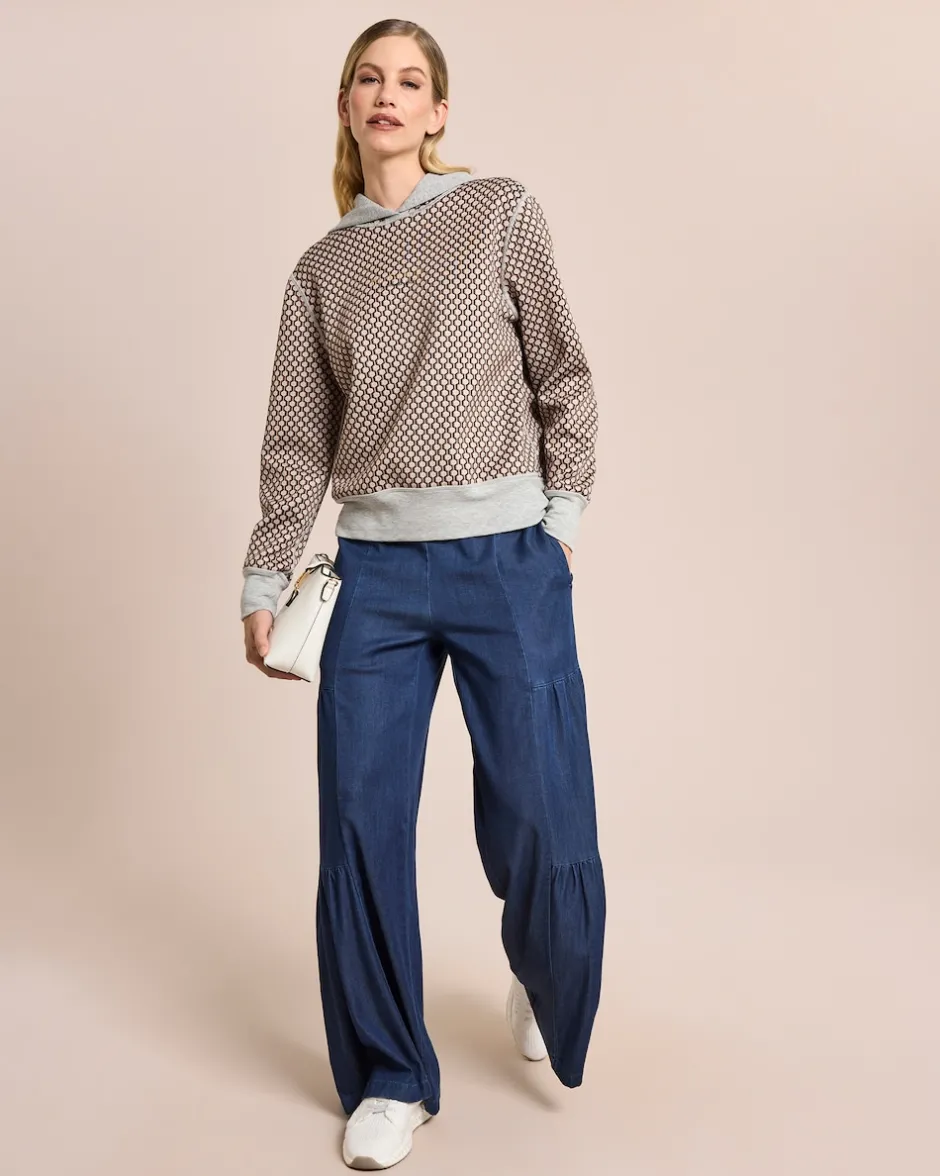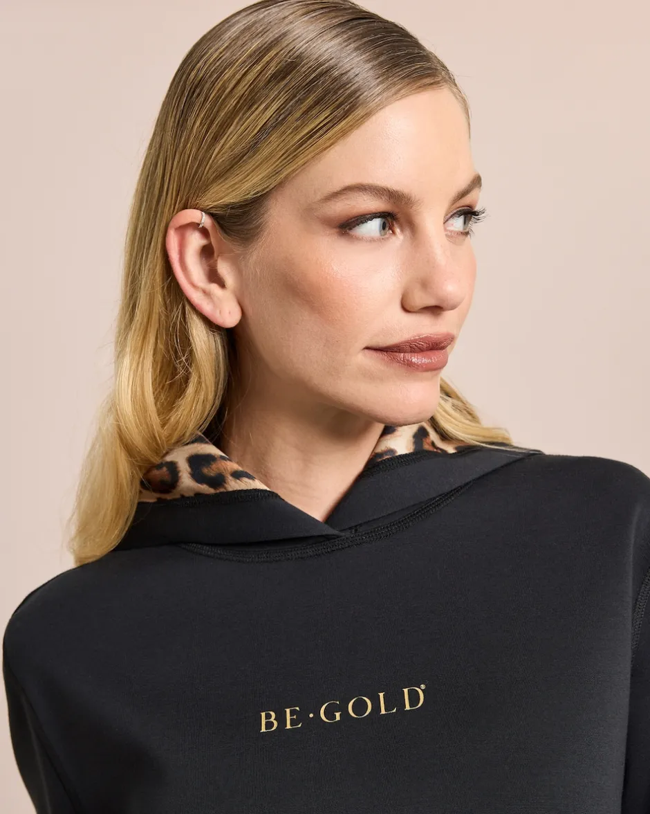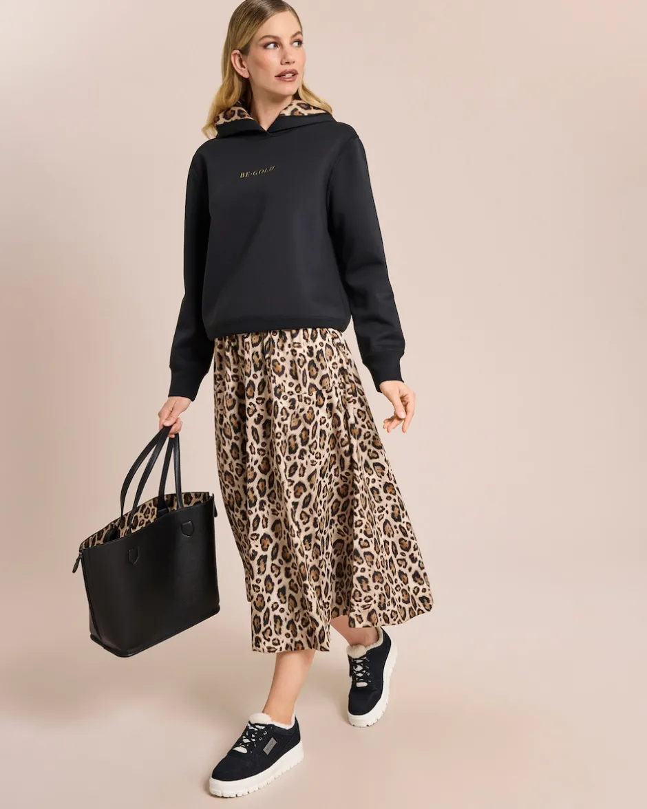 Gleich zwei Looks in einem erhalten Sie mit diesem coolen Hoodie der Linie BE GOLD by Belinda Gold. Der bequeme Sweater ist im raffinierten Wende-Design gestaltet, sodass Sie neben der klassisch einfarbigen Optik auch eine gemusterte Variante tragen können. Die Qualität ist angenehm weich und enthält einen hohen Baumwollanteil. Ein vielseitiger und kombistarker Allrounder mit relaxtem Appeal.