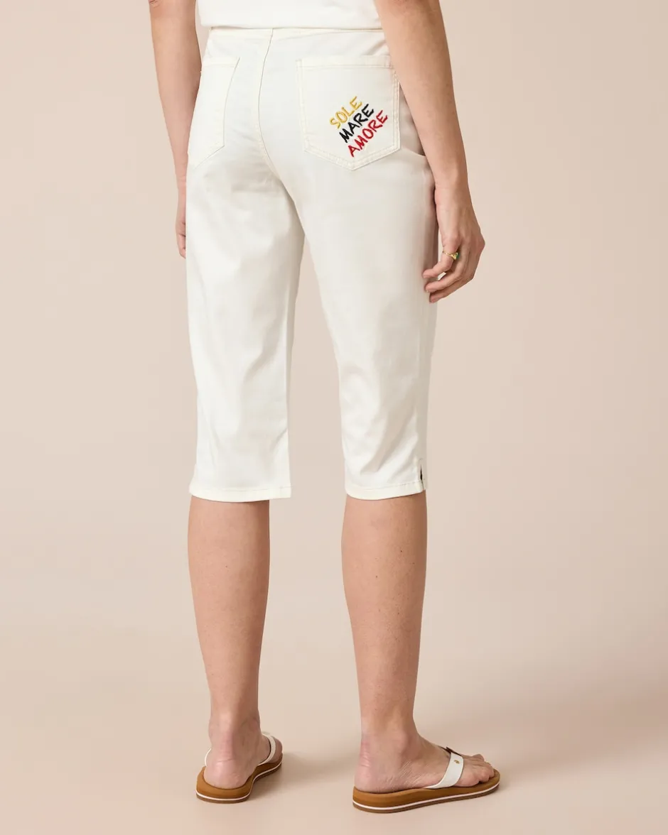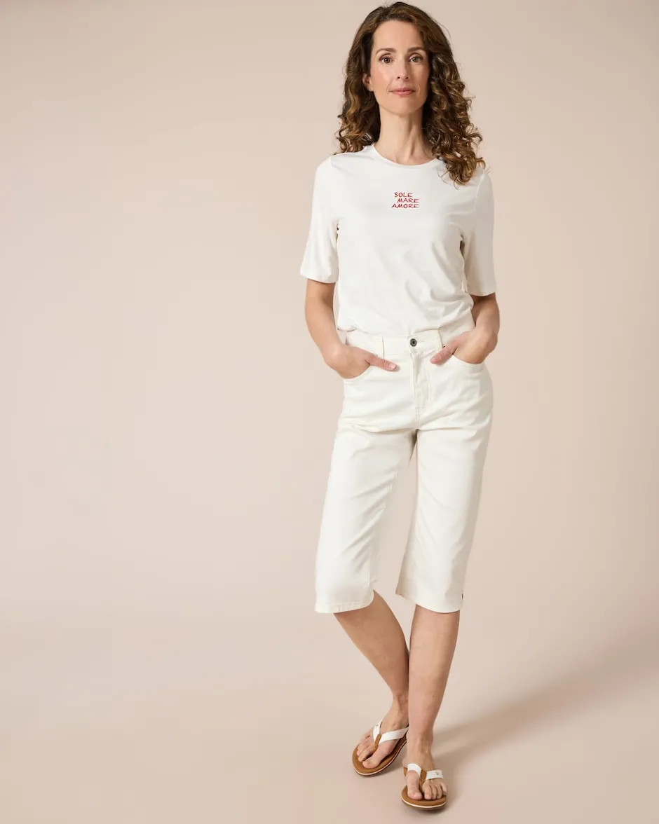 Begrüßen Sie den Sommer mit unserer Jeans in 3/4-Länge. Die Hose sitzt dank des klassischen 5-Pocket-Styles perfekt und formt einen tollen Po. Der Komfortbund schmiegt sich an Ihre Rundungen und in in den Schlaufen ist Platz für einen stylischen Gürtel. Die Gesäßtasche mit Stickerei setzt einen attraktiven Akzent. Gefertigt aus hochwertiger Baumwolle verspricht diese Hose optimalen Tragekomfort und lange Haltbarkeit. Sie lässt sich mühelos mit verschiedensten Outfits kombinieren – ob mit einem luftigen Top für einen Strandspaziergang oder einer schicken Bluse für das nächste Gartenfest.