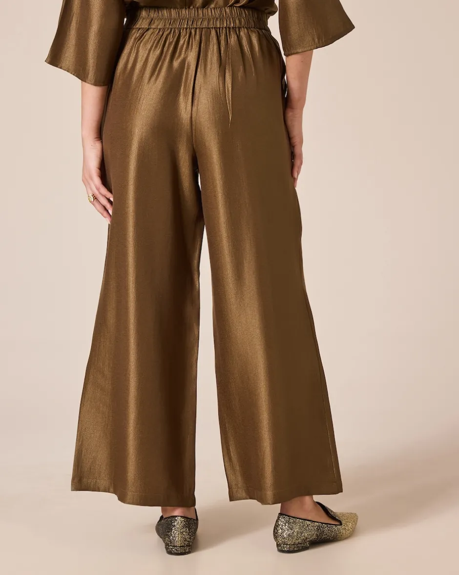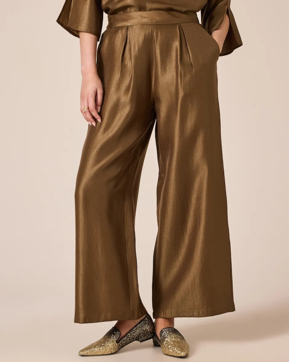 Die modische Judith Williams Hose ist weit geschnitten und umspielt in glänzender Viskose-Mix-Qualität Ihre Beine. Durch die markanten Falten auf der Vorderseite erhält die verkürzte Culotte im weiten Schnitt ein elegantes Update. Der bequeme Teildehnbund sitzt locker auf Nabelhöhe und seitliche Taschen runden das Design gekonnt ab. Freuen Sie sich auf einen neuen Partner für Ihre eleganten Abend-Outfits. Eine schwarze Bluse dazu und hohe Schuhe – fertig ist Ihr Gala-Look.
