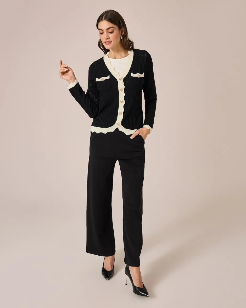 Dieser Cardigan besitzt den besonderen femininen Charme, der für die Alfredo Pauly Kollektion so typisch ist. So verleihen die aufwendigen Wellenkanten an Ausschnitt, Knopfleiste, Ärmelenden und Saum sowie an den aufgesetzten Taschen eine elegant-verspielte Note. Alle Säume sind in Kontrastfarbe gehalten, was der Optik die nötige Spannung verleiht. Perfekt ergänzt durch die edlen, goldfarbenen Knöpfe. In drei starken Farbvarianten zur Wahl.