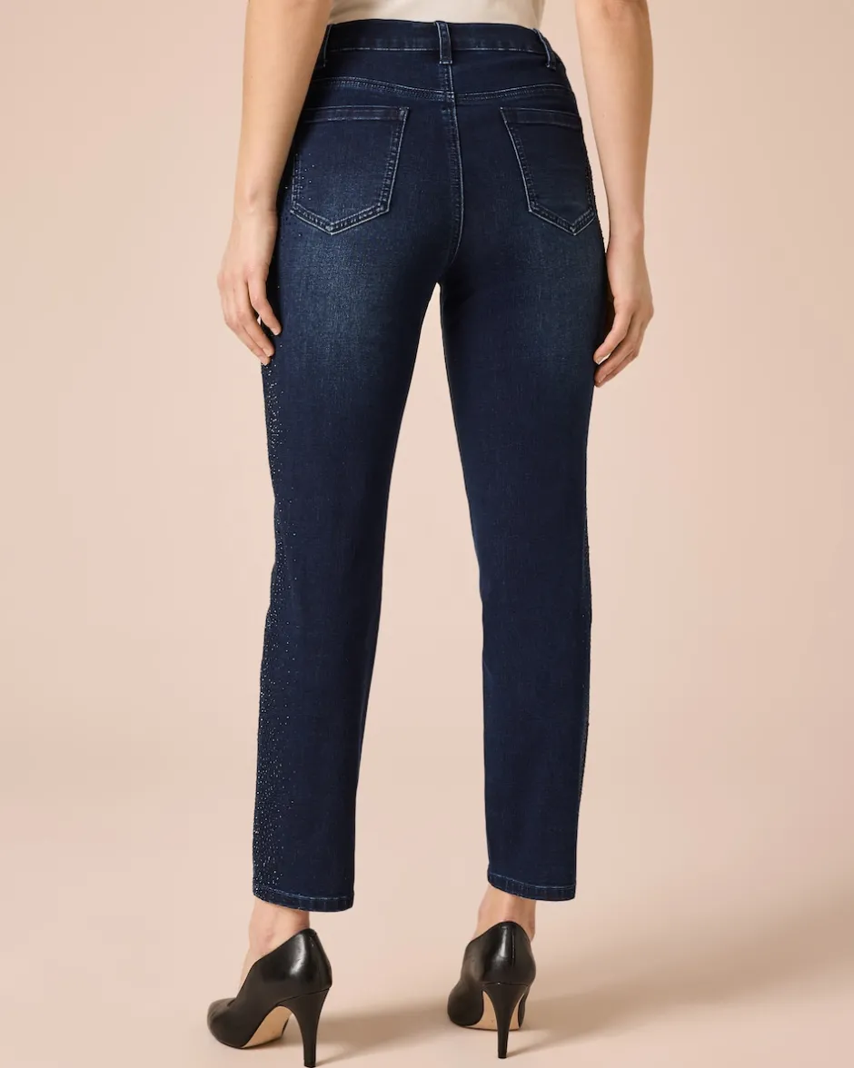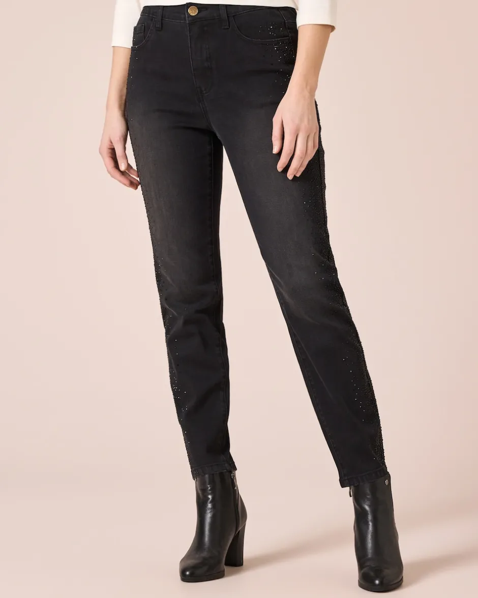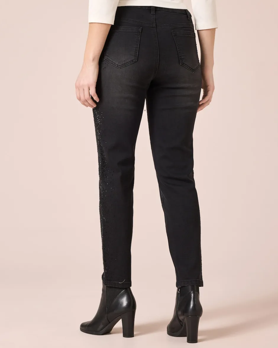 Sie lieben Jeans mit dem gewissen Extra? Unsere stylische 5-Pocket-Jeans punktet mit glanzvollen Strasssteinen, die seitlich entlang der Hosenbeine verlaufen und bei jedem Schritt funkelnde Akzente setzen. Der Teildehnbund mit Gürtelschlaufen und der Reißverschluss mit Knopf sorgen für einen angenehmen Tragekomfort und eine perfekte Passform. Das gerade Bein und der hochwertige Baumwoll-Mix runden das modische Design ab. Ob lässig mit Sneakers und T-Shirt oder schick mit hohen Schuhen und Bluse – diese Jeans ist ein wahres Kombinationstalent. Perfekt für den Stadtbummel oder den Brunch mit Freunden.