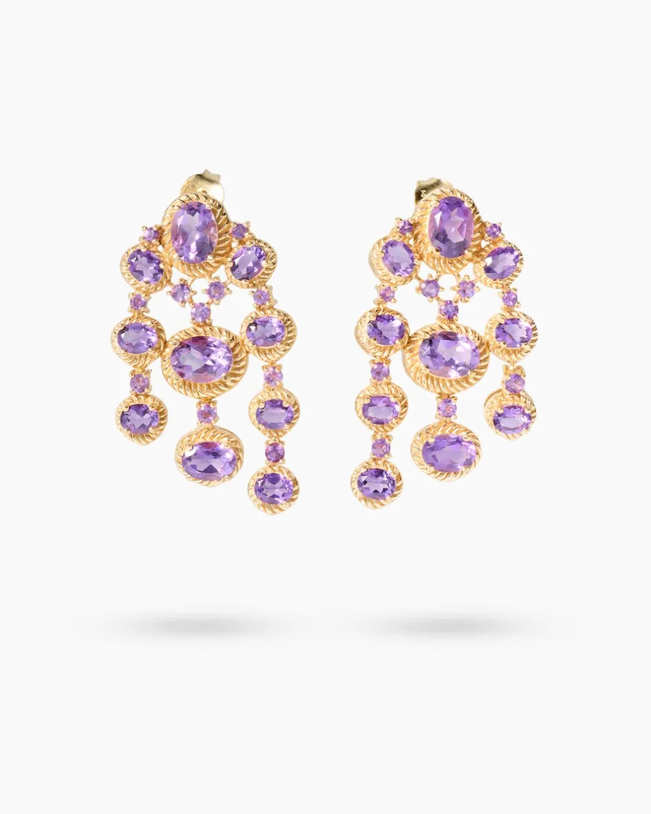 Tauchen Sie ein in die Welt des extravaganten Schmucks mit unseren Amethyst Ohrsteckern. Aus gelbvergoldetem, hochglanzpoliertem 925er Sterlingsilber gefertigt, präsentieren sie eine fantasievolle Optik. Jeder Ohrstecker ist gestaltet mit drei Strängen in verschiedenen Längen, die mit insgesamt 21 ovalen und runden, facettierten Amethysten in verschiedenen Größen besetzt sind. Alle Steine sind in Krappenfassungen gesetzt und wiegen zusammen beeindruckende 12,20 ct. Jeder Stein wird zusätzlich von einem gerieften Silberrahmen umgeben. Die auffälligen Ohrstecker bieten endlose Kombinationsmöglichkeiten. Ob bei einem festlichen Anlass, einem Business-Meeting oder einfach nur im Alltag – mit diesen Ohrsteckern ziehen Sie alle Blicke auf sich.