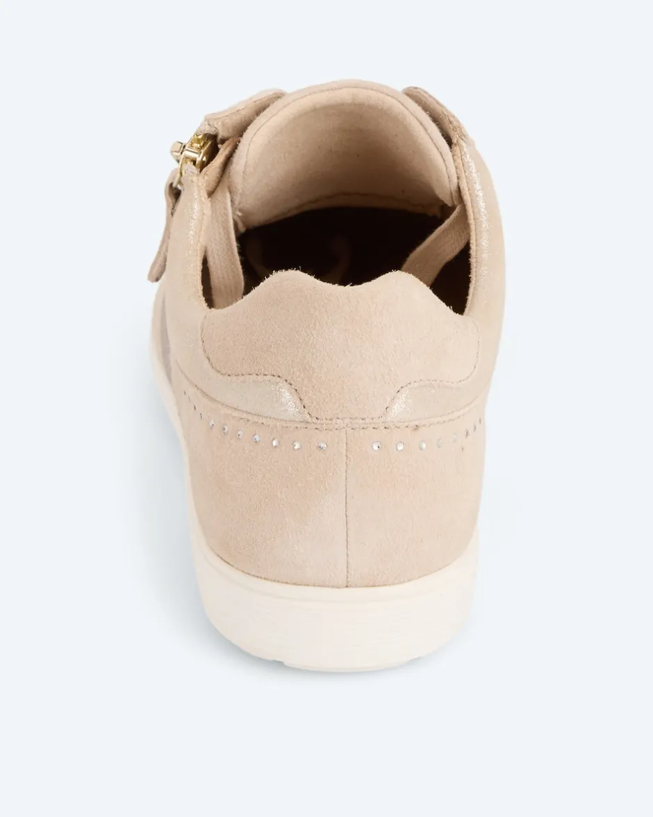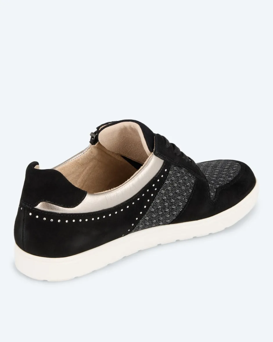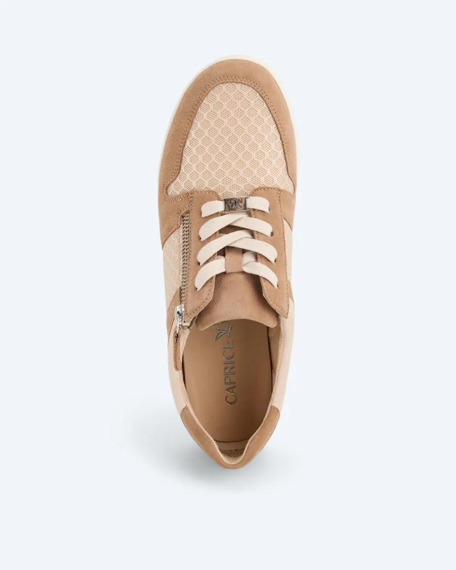 Samtiges Veloursleder und elastisches Mesh bestimmen den Charakter des charmanten Sneakers von Caprice. Der tolle Schuh mit dem praktischen Reißverschluss nimmt durch sein detailreiches Design sofort für sich ein. So gibt ihm zum Beispiel eine zarte Reihe glitzernder Dekosteinchen einen Hauch von Glamour. Die Kombi aus Schnürung und Reißverschluss sorgt für sportlichen Charme. Und die bewährten Innovationen wie die OnAir-Sohle gewährleisten, dass der schicke Schuh auch noch herrlich bequem ist. Freuen Sie sich also auf einen vielseitigen Begleiter für Ihre Styles – exklusiv bei HSE.