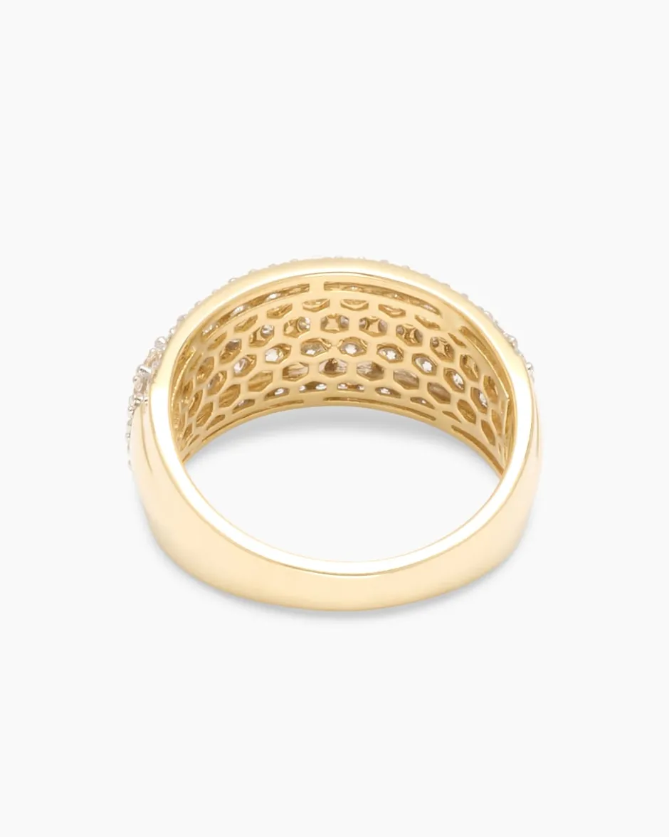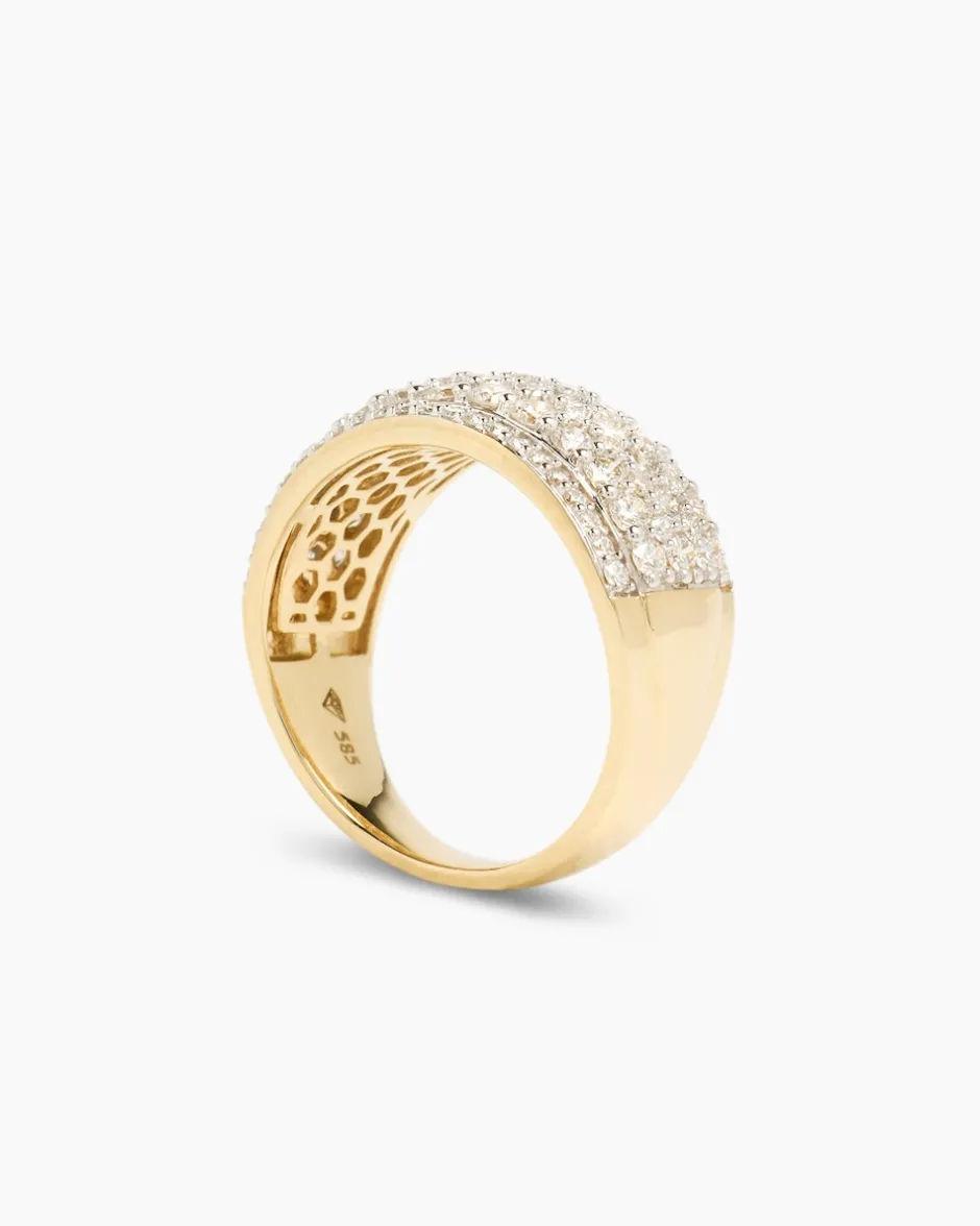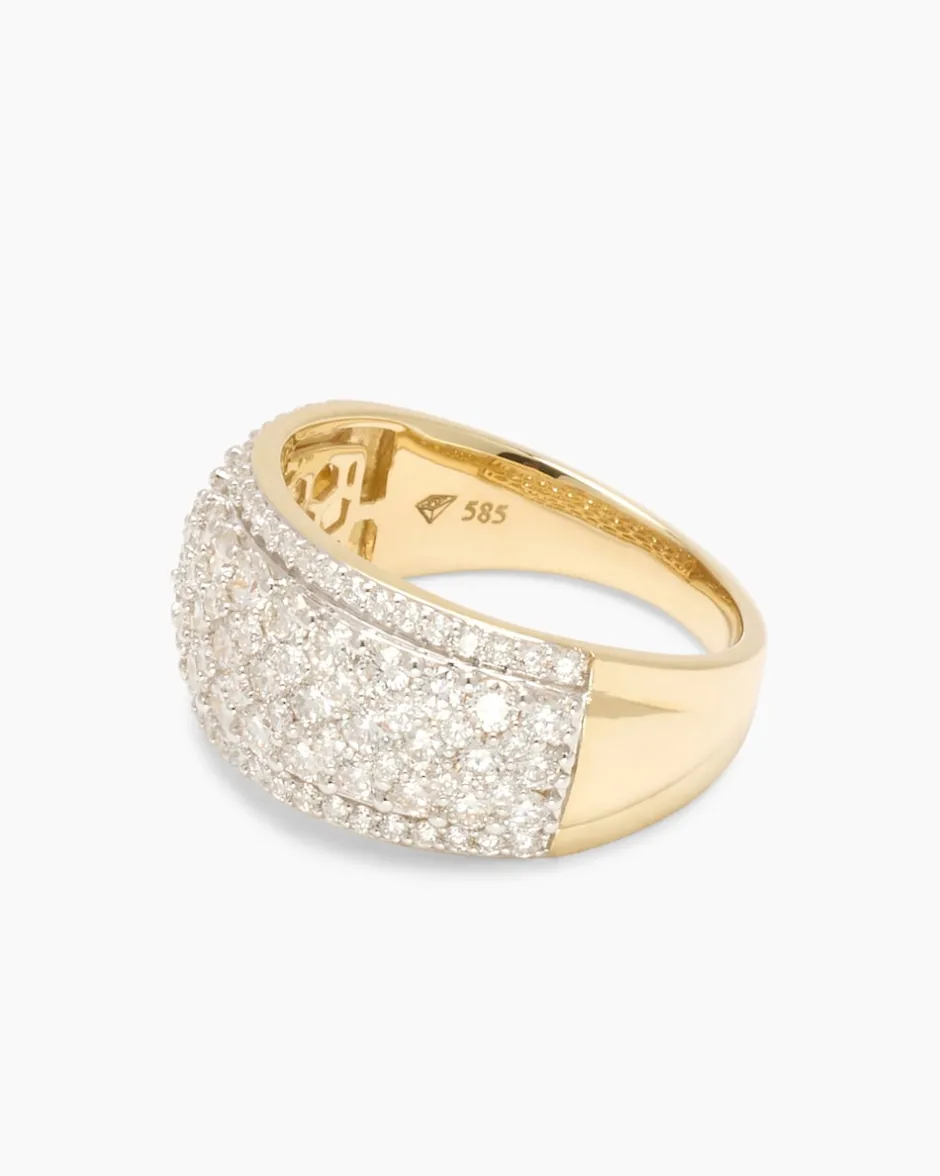 Eine derartige Brillantschmuck-Sensation bekommt man wahrhaftig nicht alle Tage zu Gesicht: Der Goldring ist mit insgesamt 107 Brillanten in klassischem Weiß ausgefasst. Alle in der Reinheit P1 und guter Schliffqualität. Die unterschiedlich großen Brillanten sitzen auf dem breiten Ringkopf dicht an dicht in kleinen Krappen. Sobald ein wenig Licht auf Ihre Hand fällt, starten die Brillanten ein unwiderstehliches Funkel-Spektakel und machen so jede Ihrer Gesten zu einer kleinen Performance.