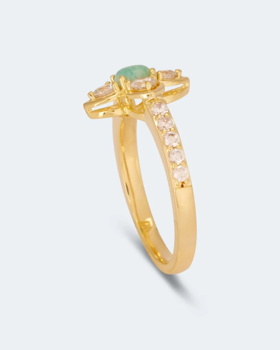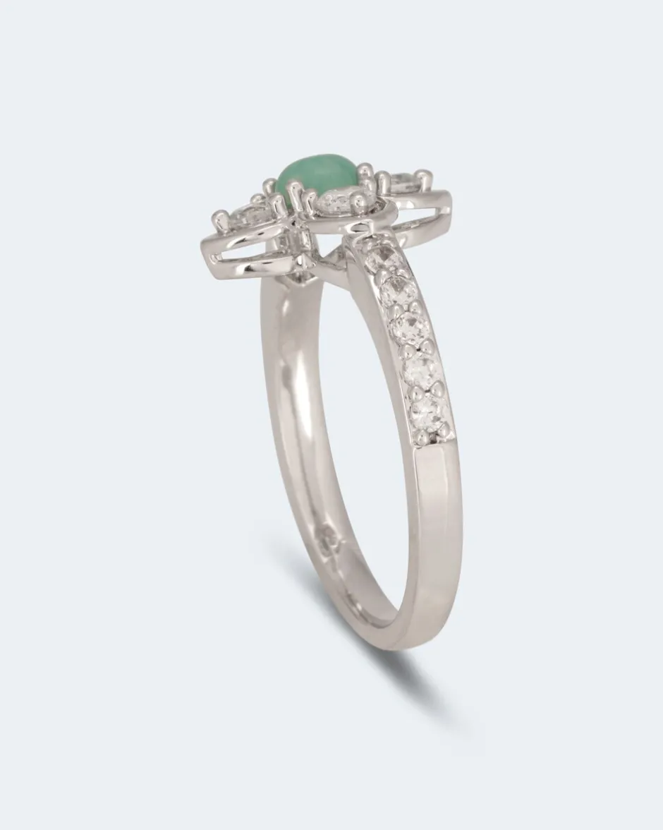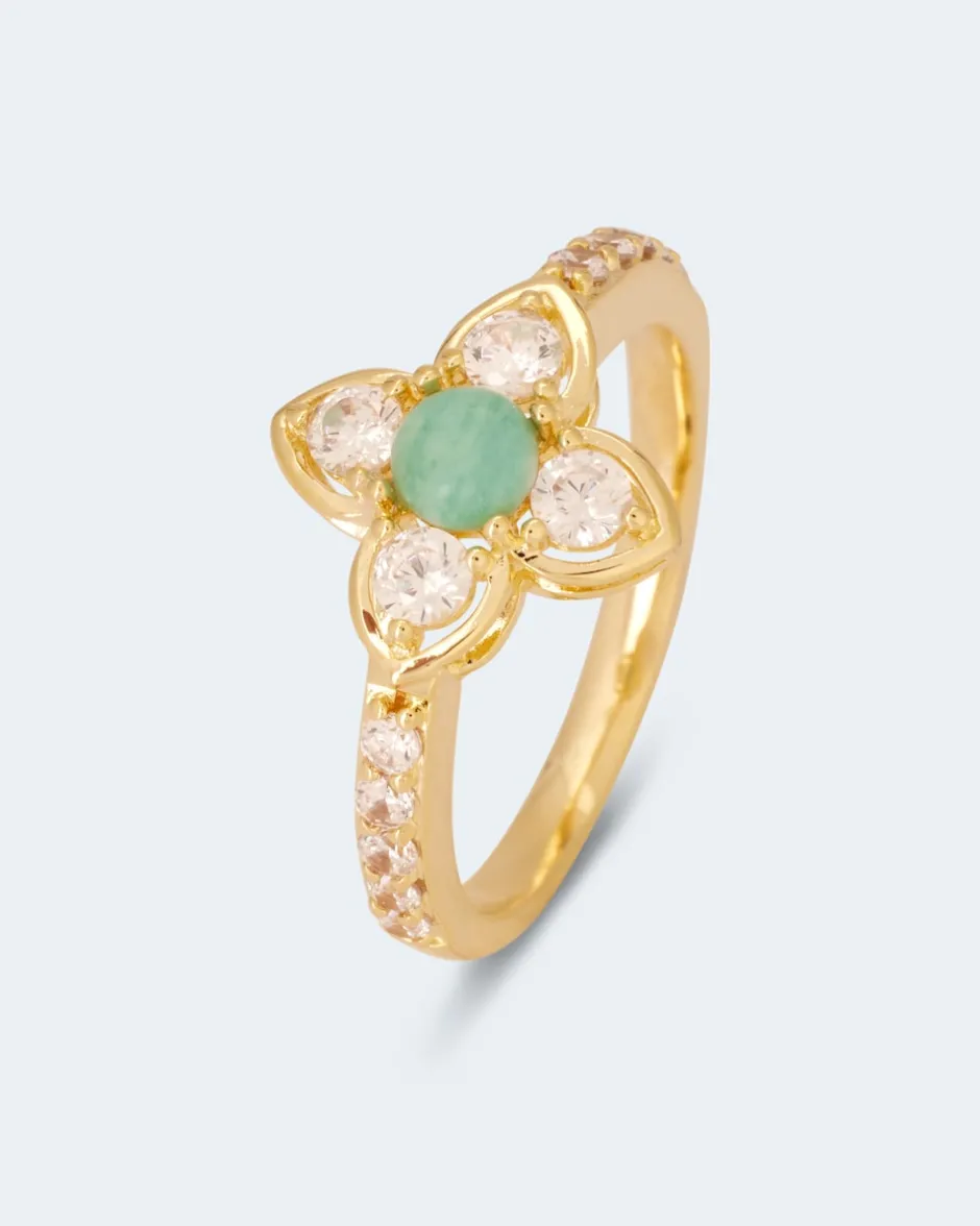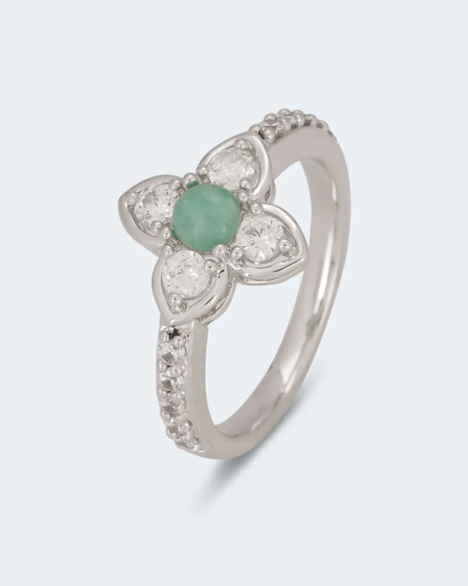 Eine zarte Zirkonia-Blüte mit Amazonit als Mittelstein macht diesen Ring aus der Linie „Jana Ina Schmuck“ zum filigranen Blickfang, der jedem Outfit Leichtigkeit und Charme verleiht. Weitere Zirkonia sind rechts und links auf den Ringschultern angeordnet. Alle Steine sind facettiert und werden in Krappenfassungen gehalten. Ihr Funkeln überträgt sich auf die Trägerin und gibt ihr ein stilvolles und gleichzeitig natürliches Auftreten. Gönnen Sie sich das Besondere.