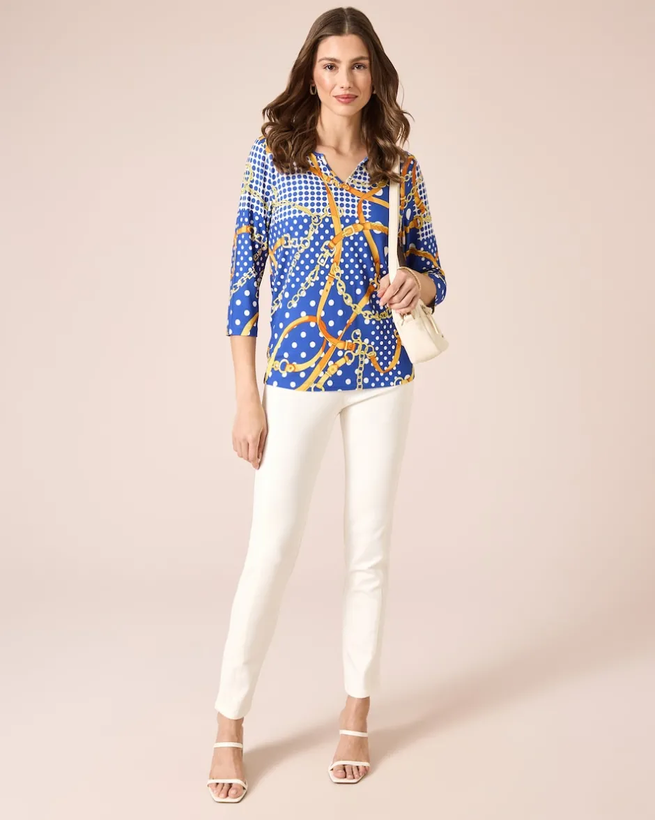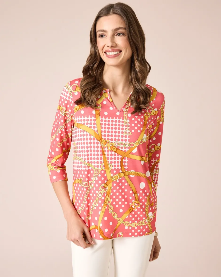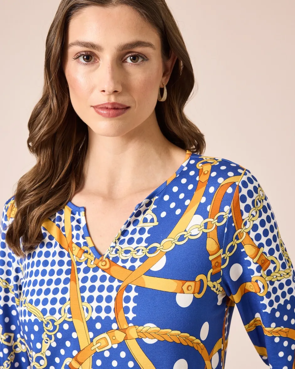 Der opulente Print aus Schmuck-, Punkte- und Gürtelelementen macht dieses Shirt zu einem typischen Alfredo Pauly Style. Das elegante Motiv wurde auf eine feine Viskose-Qualität gedruckt und kommt dadurch besonders farbintensiv zur Geltung. Betont feminin ist auch die Schnittführung, mit vielseitigen ¾-Ärmeln und V-Schlitz am Ausschnitt. Ein rundum gelungener Kombipartner für Frühling und Sommer.