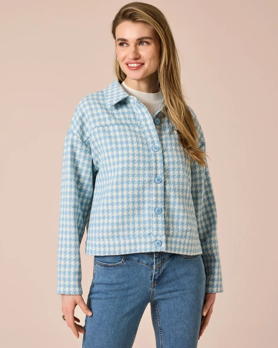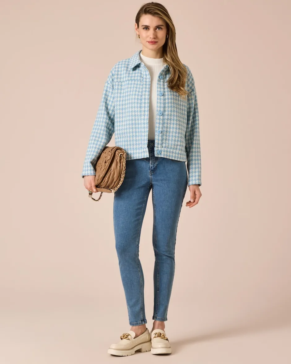 Entdecken Sie einen vielseitigen Blazer mit ausgeprägtem Kombitalent aus der neuen Kollektion von Jana Ina. Das elegante Allover-Hahnentritt-Muster ist in aparter Bicolor-Karo-Optik umgesetzt. Der frische und junge Look mit lässigem Hemdkragen und durchgehender Knopfleiste verleiht dem Blazer einen sportiven Touch – unkompliziert tragbar zu fast jedem Anlass.