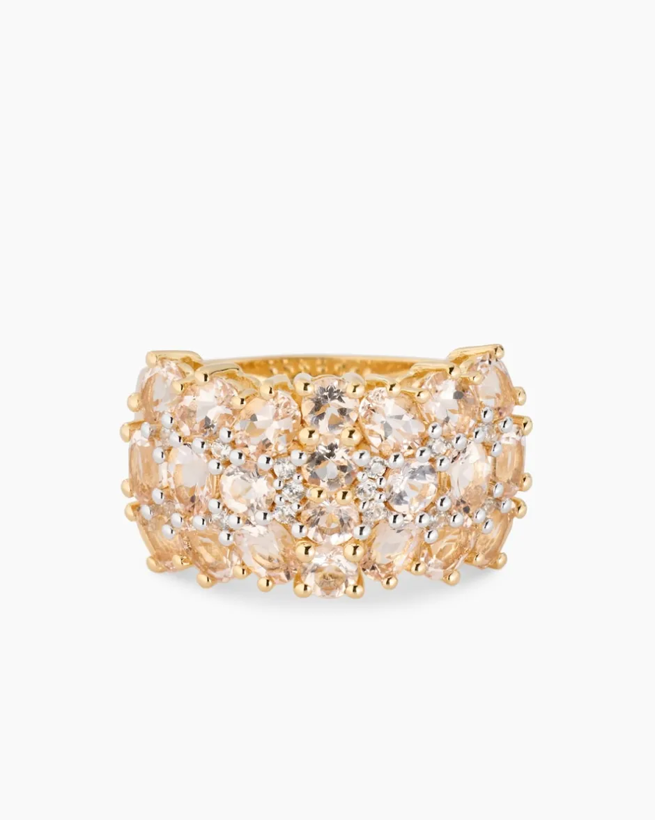 Der üppige Edelsteinbesatz mit 22 brasilianischen Morganiten in zartem Rosé macht diesen Ring zu einem charmanten Hingucker mit Romantik-Appeal. Zwischen den Morganiten in runder oder ovaler Form sind zudem 14 runde, weiße Zirkone aus Indien eingefasst. Alle Edelsteine sind mit feinen Facetten versehen, so dass sie ihr luxuriöses Funkeln bei jeder Bewegung in alle Richtungen versprühen. Zauberhaft abgerundet durch die sonnenwarme Gelbgoldoptik der vergoldeten Edelmetalllegierung aus bestem Sterlingsilber 925.