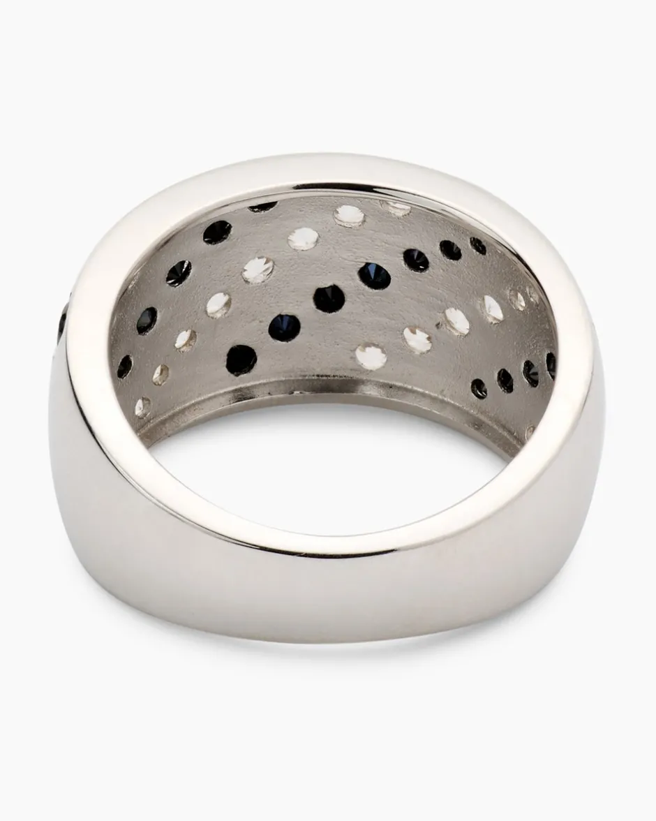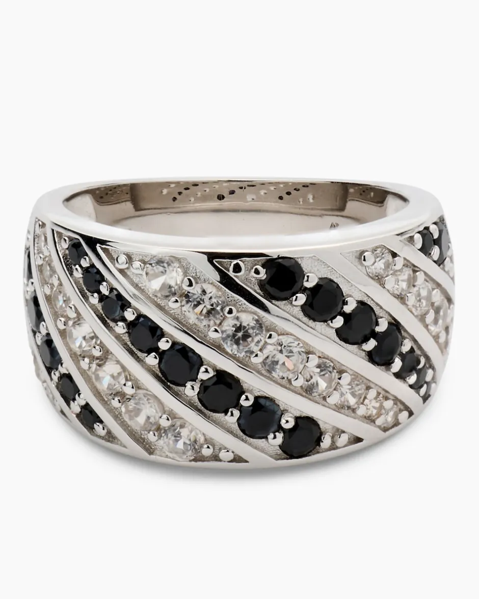 Nehmen Sie sich einen Moment Zeit und genießen Sie die Ringschönheit mit weißen und schwarzen Edelsteinen: ein Ring in hochglanzpolierter Weißgold-Optik, besetzt mit 22 schwarzen Spinellen und 22 weißen Zirkonen. Alle Edelsteine sind rund und im Facettenschliff veredelt. Stellen Sie sich das Glitzerspektakel vor, das bei jeder Ihrer Gesten entsteht. Mit diesem Ring werten Sie jeden Look im Handumdrehen auf oder Sie verleihen einem Abendoutfit den letzten Schliff.