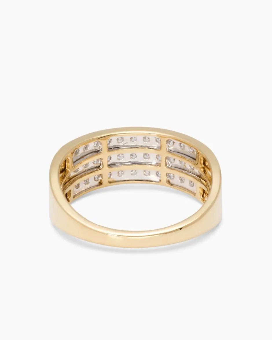Brillanten in drei Reihen strahlen ihre Gegenüber an, wenn Sie diesen chrismatischen Ring von Marvin Kulik tragen. Der atemberaubend schöne Bandring aus feinem 585er Gelbgold hält 39 weiße Brillanten – ein beeindruckender Anblick. Die Brillanten sind dicht an dicht in Krappen gefasst und bedecken eine Seite der Ringschiene. Um das Funkeln der Edelsteine zu unterstützen, sind die gelbgoldenen Krappen teilweise rhodiniert. In der klaren Form des Rings entfalten die wunderschönen Steine ihre Magie. Für Ihren Tragekomfort und damit der Ring immer gut sitzt, verjüngt sich die Ringschiene nach hinten. Bereichern Sie Ihr Schmuck-Kollektion um dieses edle Schmuckstück mit Blickfang-Garantie.