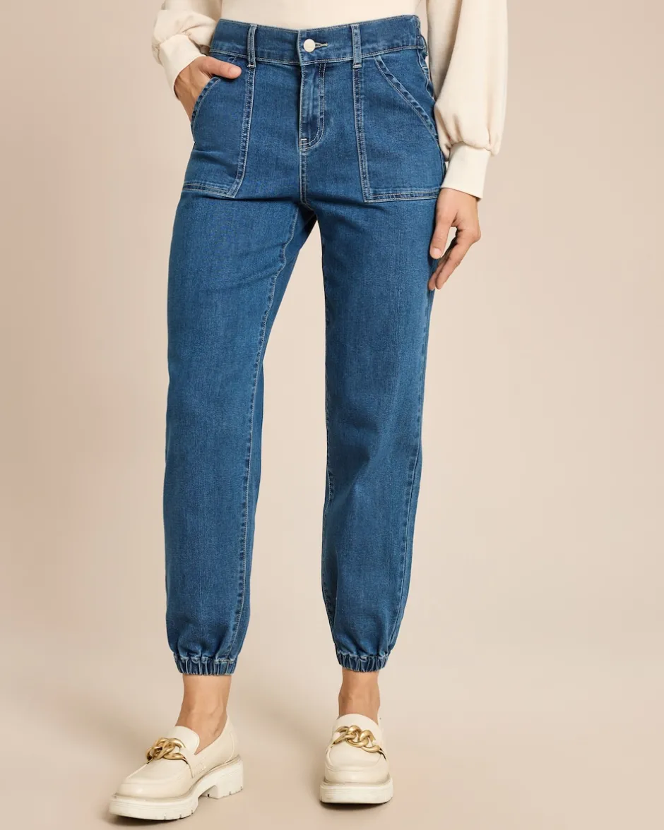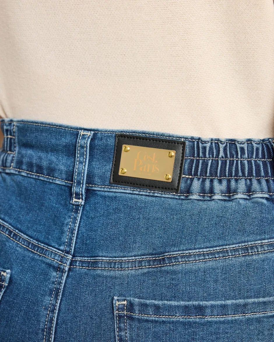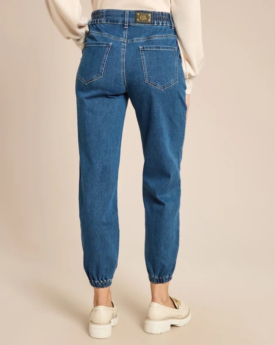 Hosen im lässigen Jogpant-Style sind auch in dieser Saison angesagt. Das Modell von C’est Paris kombiniert den beliebten Trend mit der zeitlosen Jeans-Optik – und schafft so ein cooles Must-have für modische Casual-Outfits. Als weitere Akzente fallen die großen Vordertaschen und die elastischen Bündchen ins Auge. Und bequem ist sie auch noch: Die hochwertige Hose hat einen Teildehnbund.