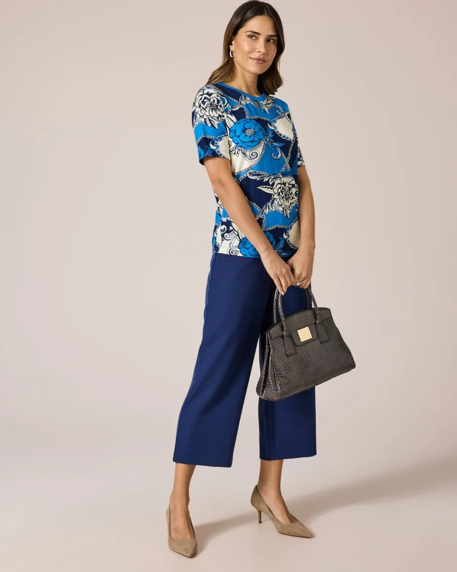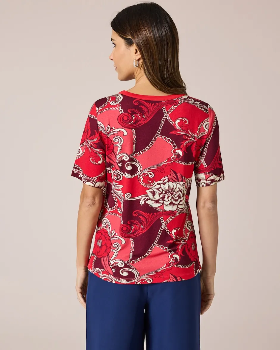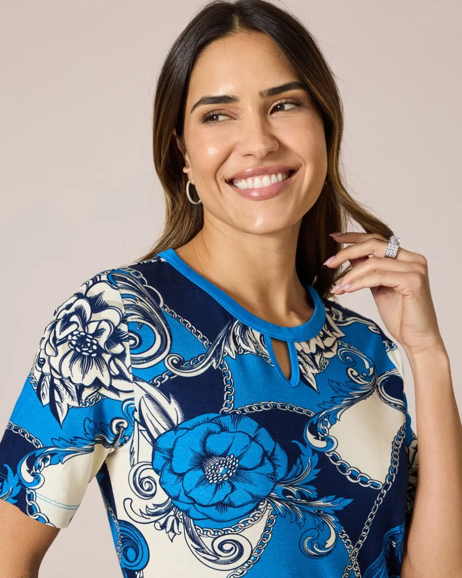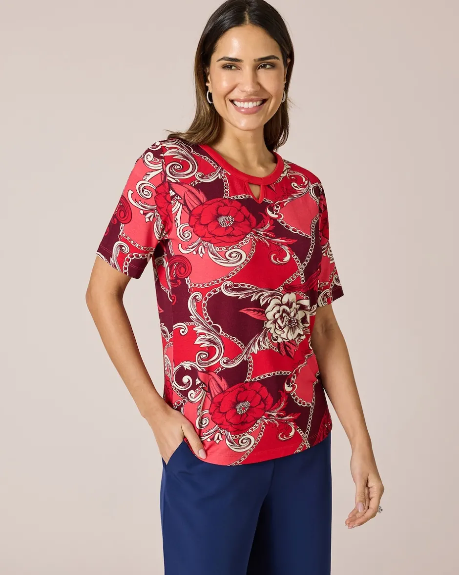 Tragen Sie auch gerade in der warmen Jahreszeit gerne mal was Buntes? Dann ist dieses hinreißende Shirt perfekt: Das ist allover mit stilvollen Ornament- und Rosenmotiven in intensiv leuchtenden Farben bedruckt – ein unwiderstehlicher Look mit vielen Kombimöglichkeiten. Ein hübscher Extra-Hingucker ist der Rundhalsausschnitt mit Uni-Paspel und frechem Cut-Out in der Motte. In superzarter Viskose-Stretch-Qualität figurnah geschneidert, trägt sich das Shirt in jeder Lebenslage absolut angenehm.
