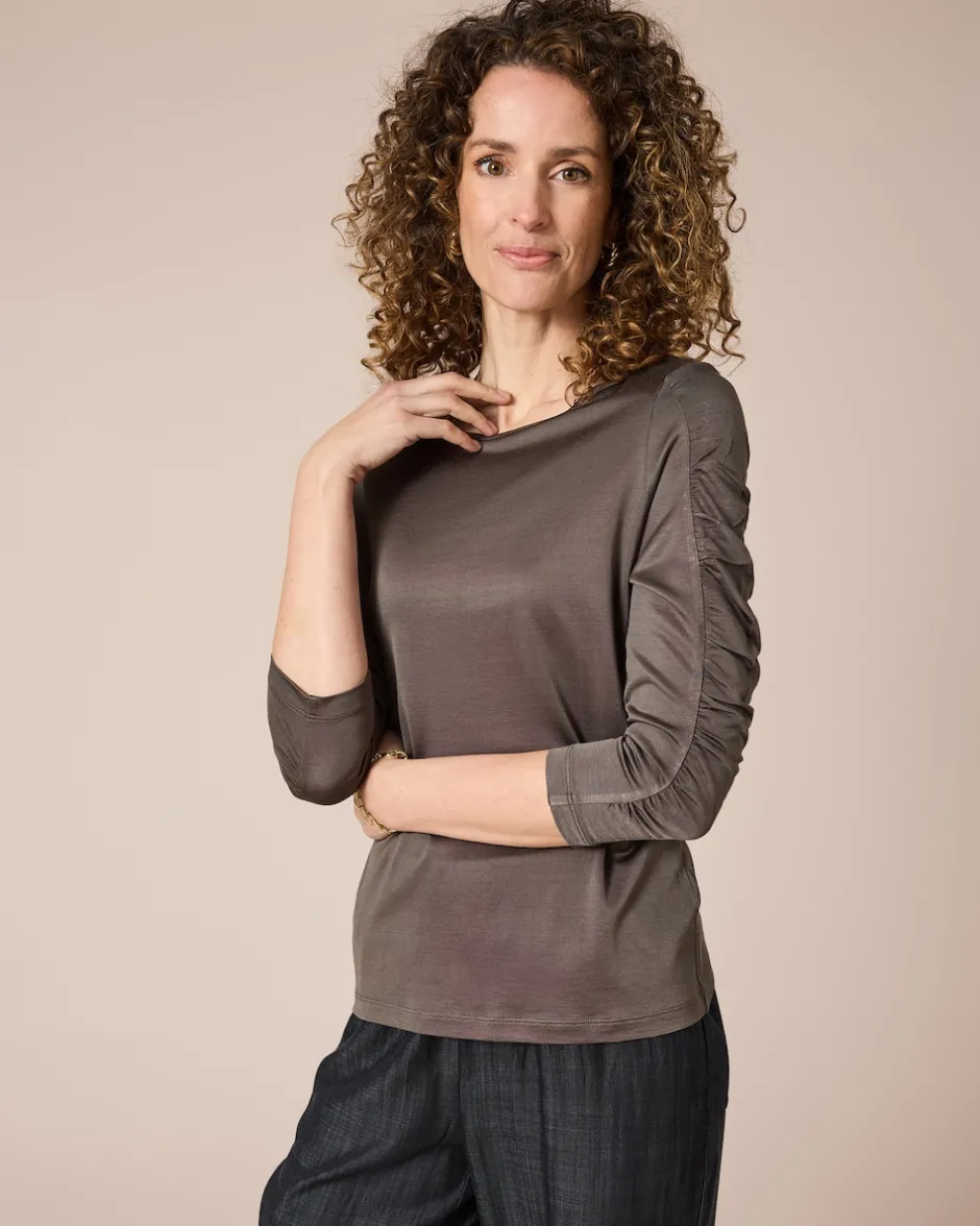 Entdecken Sie Ihr neues Lieblingsstück: Dieses Shirt vereint elegantes Uni-Design mit einem Hauch von Luxus. Der seidige Glanz und der modische Rundhalsausschnitt verleihen Ihnen eine stilvolle Ausstrahlung. Die dezenten Schulterpolster und der 3/4-Arm mit hübscher Raffung setzen besondere Akzente. Dank des hautsympathischen Viskose-Mixes genießen Sie dabei höchsten Tragekomfort. Dieses Shirt ist ein wahres Kombinationstalent: Ob zur eleganten Hose im Büro, zum verspielten Rock beim Stadtbummel oder zur lässigen Jeans beim Treffen mit Freunden – Sie sind immer perfekt gekleidet. Ein idealer Begleiter für jeden Anlass.