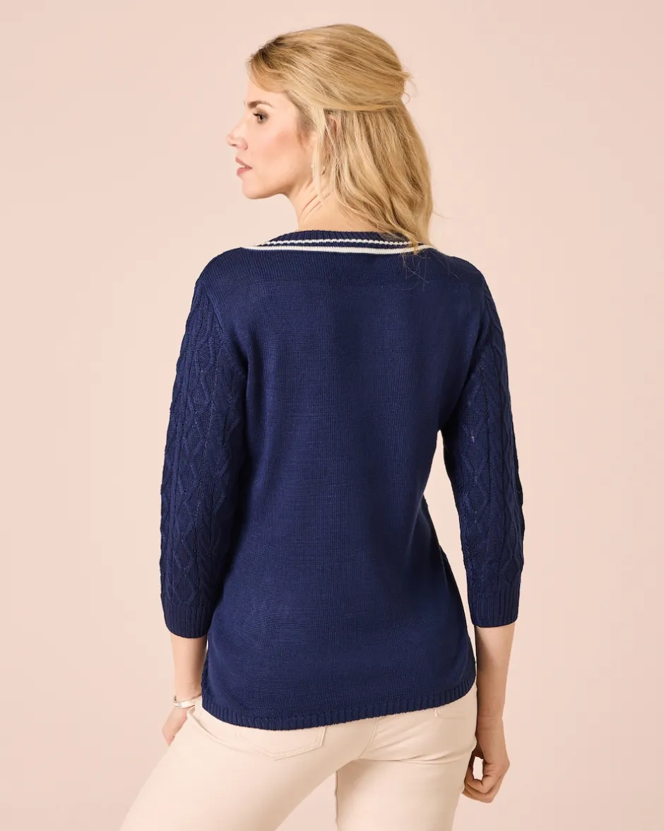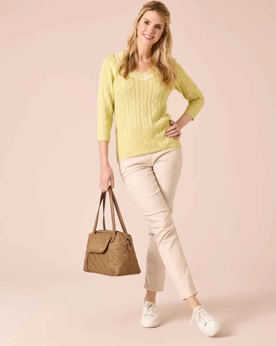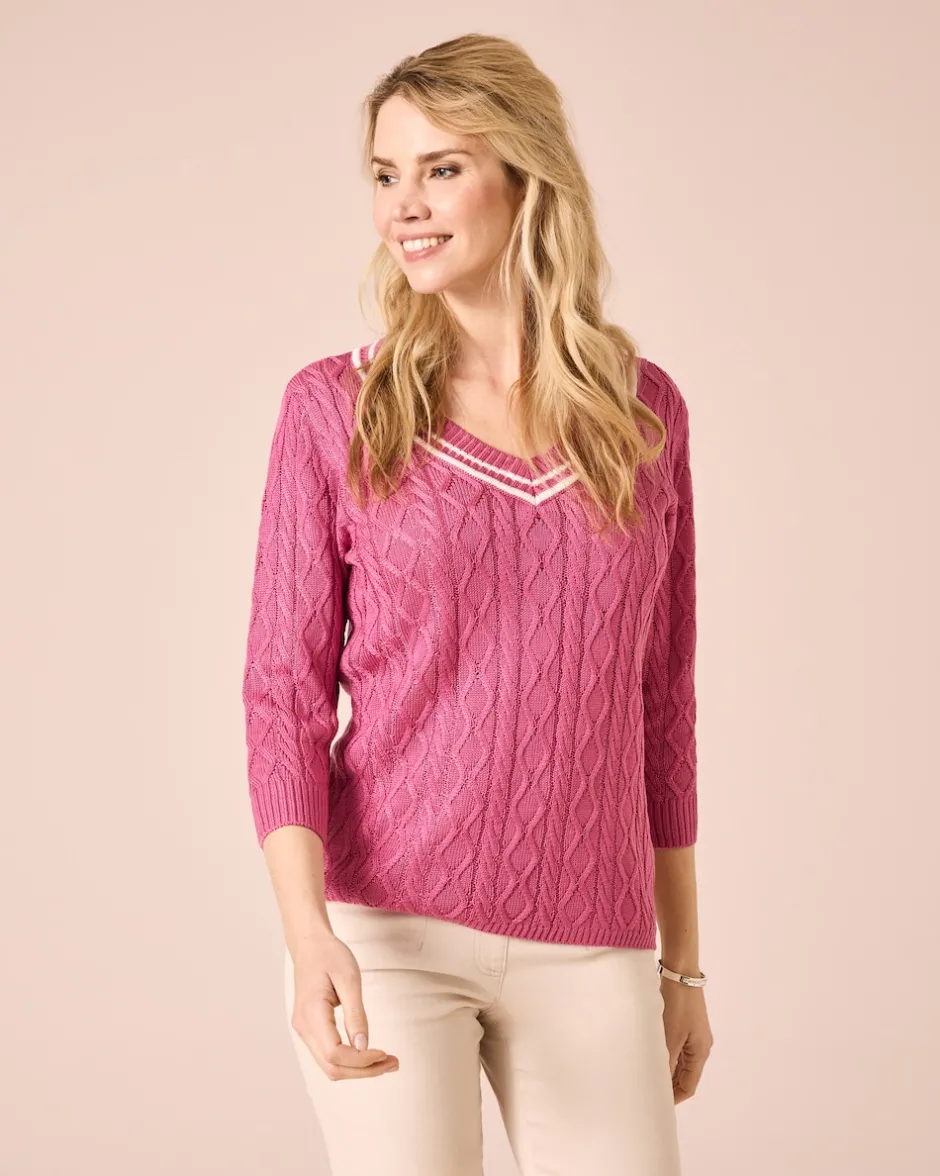 Jugendlich-frisch und dynamisch, so kommt dieser leichte Sommerpullover aus der neuen Helena Vera Kollektion daher. Dafür sorgt das verspielte Rauten-Zopfstrickmuster in Längsrichtung auf der Front und den Ärmeln. Die Rückseite ist glatt gehalten. Als einzige Verzierung dient der doppelte Kontraststreifen rund um den V-Ausschnitt – ein sehr lässiges und unaufgeregtes Stil-Element. Besten Tragekomfort verspricht die atmungsaktive Strickqualität mit hohem Viskoseanteil.