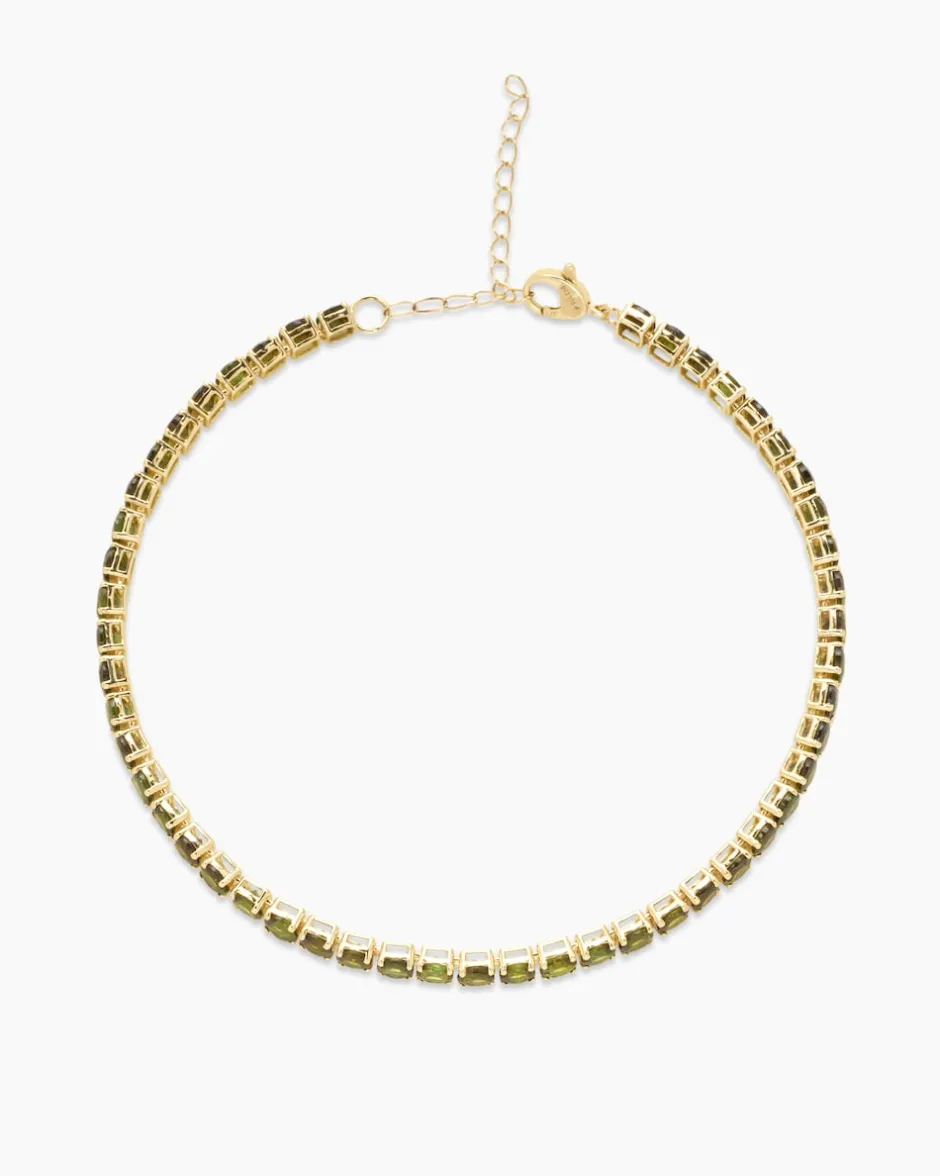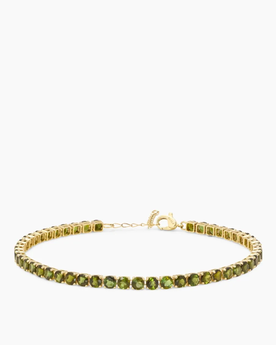 Wenn Sie auffallenden Edelsteinschmuck in tollen Farben schätzen, werden Sie sich sofort in dieses bezaubernde Armband verlieben. Der Armschmuck besteht aus runden Turmalinen. Im Facettenschliff veredelt und in Krappen gefasst, leuchten die Turmaline in einem frischen Grün. Das Armband ist ca. 17,5 cm lang und verfügt über ein 3,5 cm Verlängerungskettchen. Verschlossen wird das Armband mit einem sicheren Karabiner aus Gelbgold 375. Mit diesem Accessoire runden Sie jeden Look harmonisch ab.