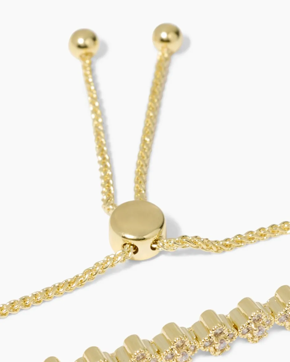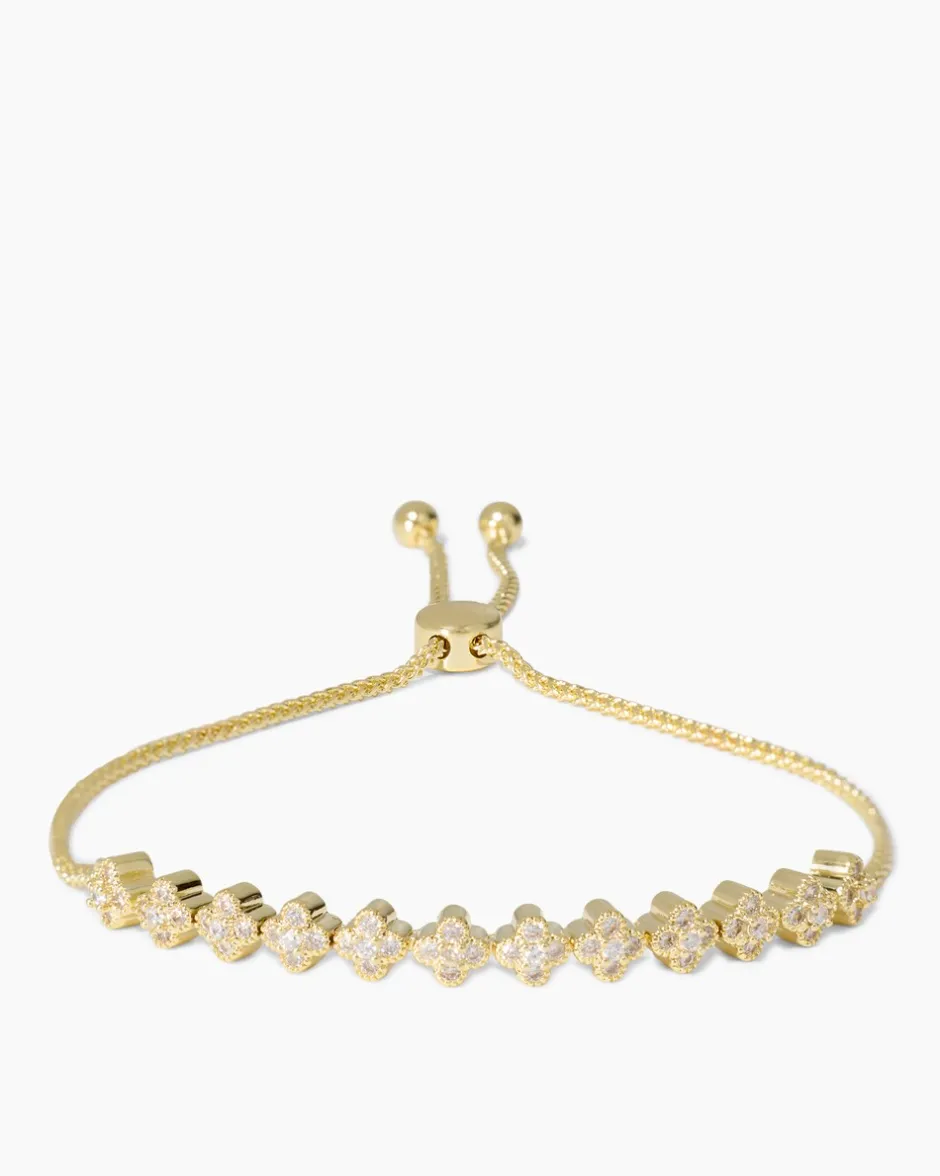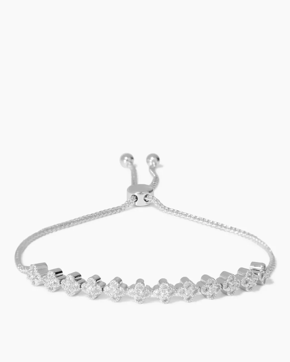 Dieses reizende Armband besticht durch sein filigranes, zartes Design. Die blütenförmigen Elemente sind mit weißem Zirkonia besetzt und sorgen so bei jeder Handbewegung für hübsche Glitzer-Effekte. Raffiniert: Der modische Slider bildet einen weiteren Blickfang und erlaubt eine individuelle Größeneinstellung. Je nach Geschmack kann das Armband mit gelbvergoldetem oder palladiniertem Finish bestellt werden.