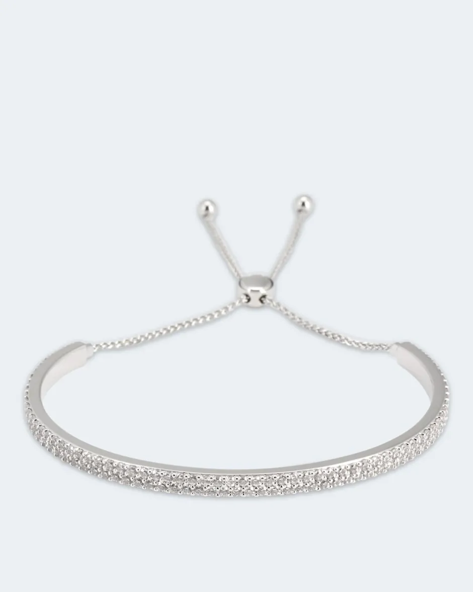 Das Armband in hochglanzpolierter Silberoptik ist mit 133 weißen Zirkonia ausgefasst. Die runden Steine sind im Facettenschliff veredelt und glitzern einnehmend. Verschlossen wird das funkelnde Accessoire mit einem Sliderverschluss. Der Verschluss ist nicht nur optisch eine Zugabe, er ermöglicht Ihnen auch die individuelle Längeneinstellung. Ein Armband, das Sie den ganzen Tag mit Funkelzauber und einem zarten Klingeln begleitet.
