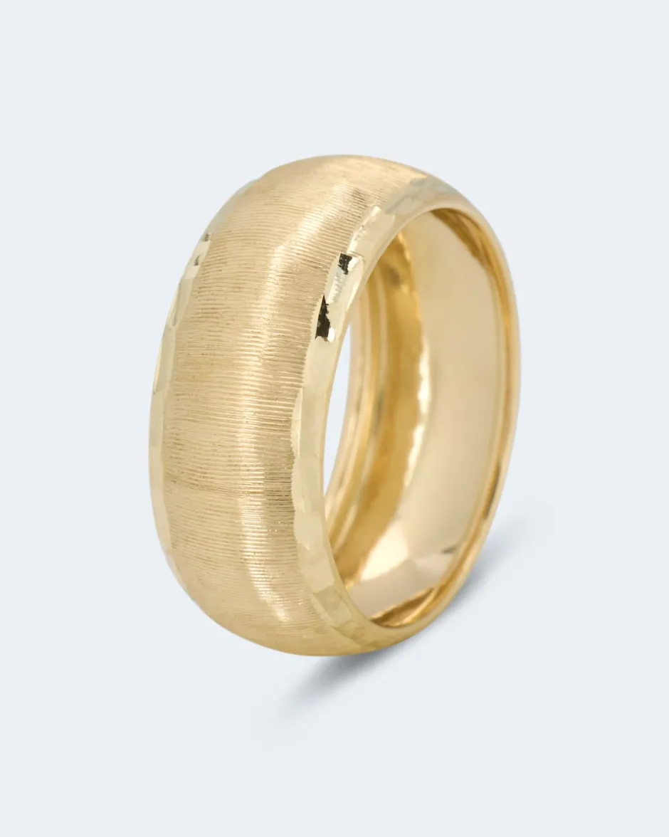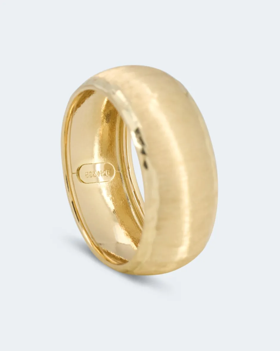 Mit diesem Bandring sichern Sie sich einen stilvollen Begleiter in hochwertiger Verarbeitung, der jeden Tag in einen Schmucktag verwandelt und jedes Outfit veredelt. Aus hochwertigem Gelbgold 585 geschmiedet, gefällt der Ring durch seine edel satinierte Außenseite und die diamantgeschliffenen Kanten. Abgerundet wird der elegante Look durch die hochglanzpolierte Innenseite. Tipp: Passende Halbcreolen im selben Design finden Sie unter 472904.
