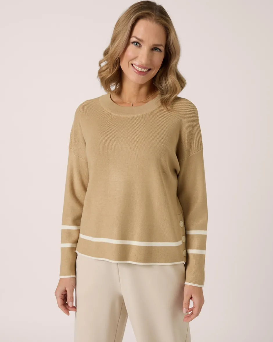 Kuschelweich, angenehm warm und wunderschön anzusehen – mit diesem Pulli stellen Sie ruckzuck schicke Outfits für Job oder Freizeit zusammen. Das Oberteil in stylischer Kastenform („Boxy“) kommt im Unidesign mit eingestrickten Kontraststreifen am Saum und den Ärmelenden. Ebenfalls in Kontrastfarbe sind die insgesamt sechs Zierknöpfe mit THOM-Logo an den Seiten gestaltet. In vier aktuellen Modefarben zur Wahl.