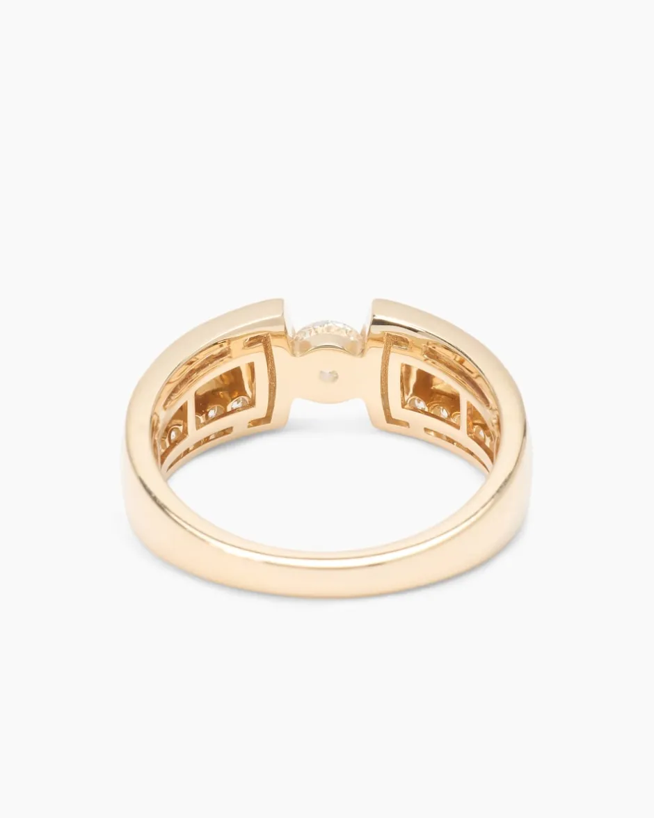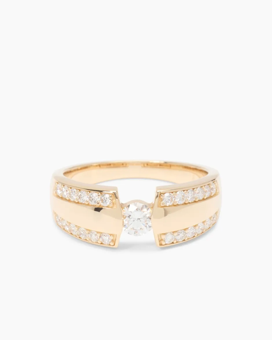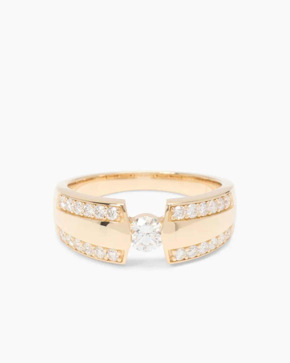 Dieser aparte Ring aus der Linie Diamantaire aus hochglanzpoliertem 585er Gelbgold ist mit einer 2,5 Millimeter breiten Ringschiene ausgestattet. Den Ringkopf zieren insgesamt 25 lupenreine Brillanten, von denen ein größerer den Mittelstein bildet. In einer Kanalfassung kann er seine Attraktivität voll entfalten. Flankiert wird er von 24 kleineren Brillanten, die in Krappenfassungen gehalten werden. Die lupenreinen Edelsteine sind von sehr guter Schliffqualität und das qualitativ hochwertige Schmuckstück ist made in Germany. Das raffinierte Design, das edle Gold und die hochwertigen Luxussteine machen aus diesem Ring etwas ganz Besonderes.