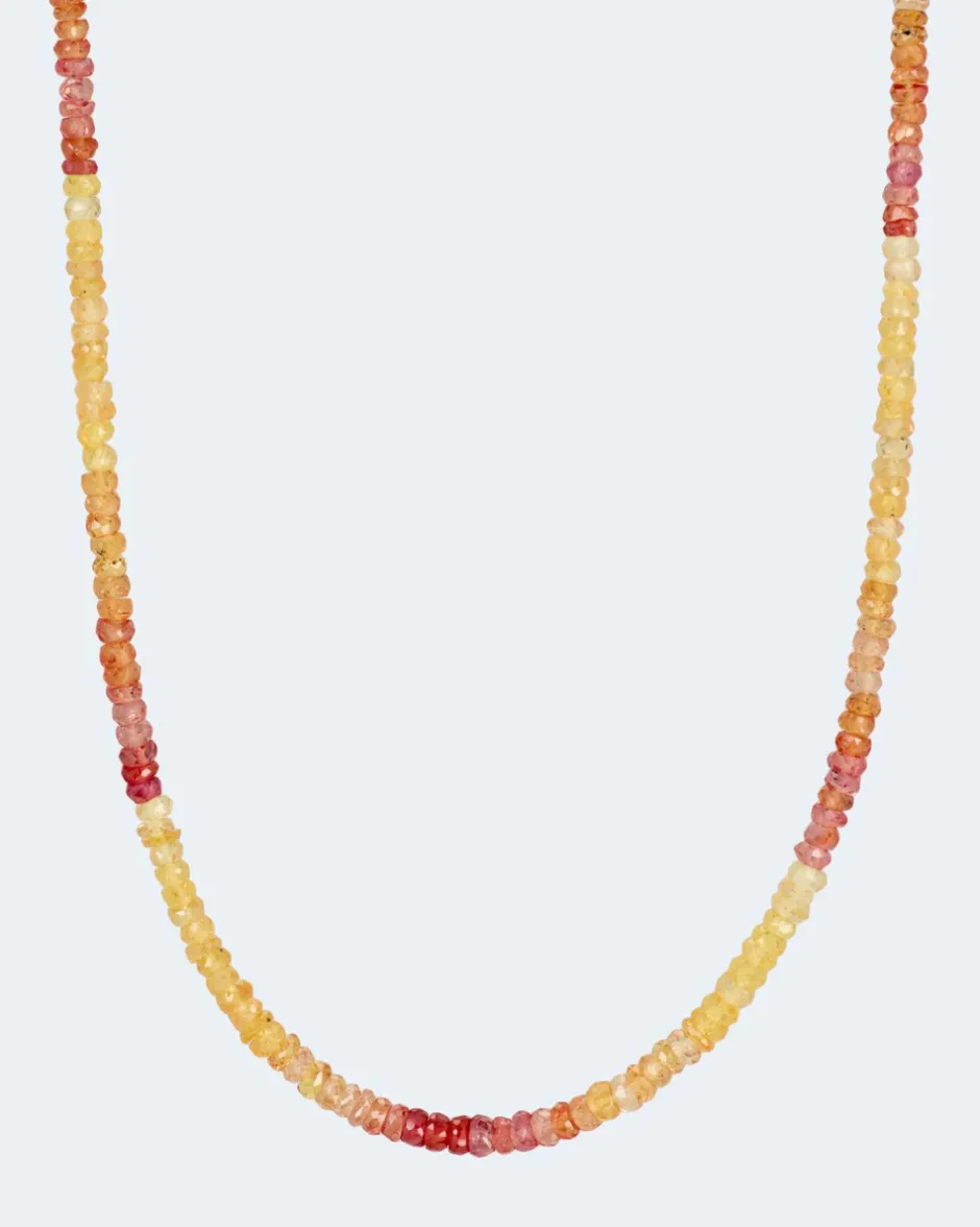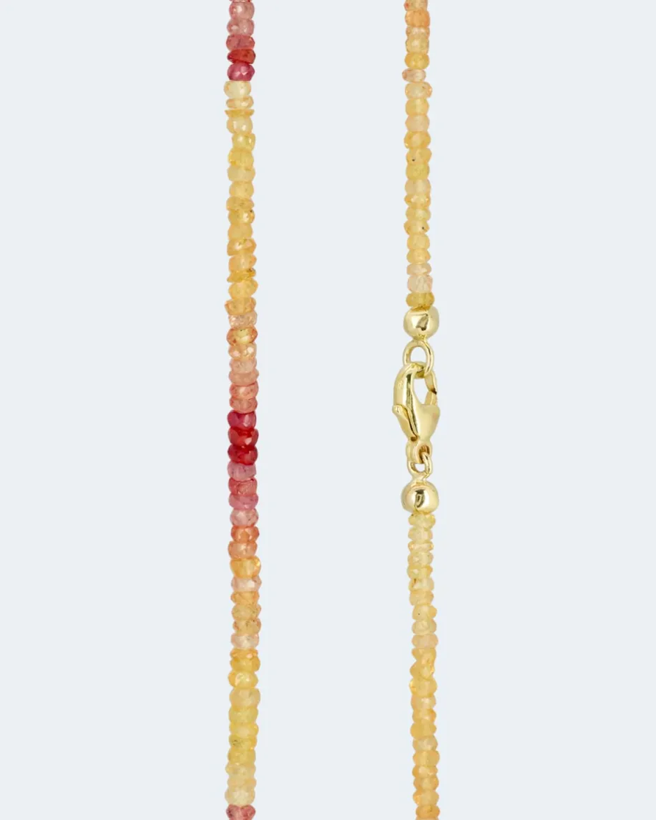 Mit einem bunten Edelstein-Collier peppen Sie jeden Look ruckzuck auf oder Sie runden ein Outfit harmonisch ab. Das Collier hier aus bunten Saphir-Rondellen sorgt in jedem Fall für gute Laune. Die Saphire sind allesamt sorgfältig facettiert und auf Stahldraht gefädelt. Dank des Schliffs funkeln und glitzern die Edelsteine atemberaubend schön. Verschlossen wird Ihr neues Accessoire mit einem Karabiner aus hochglanzpoliertem Gelbgold 375.