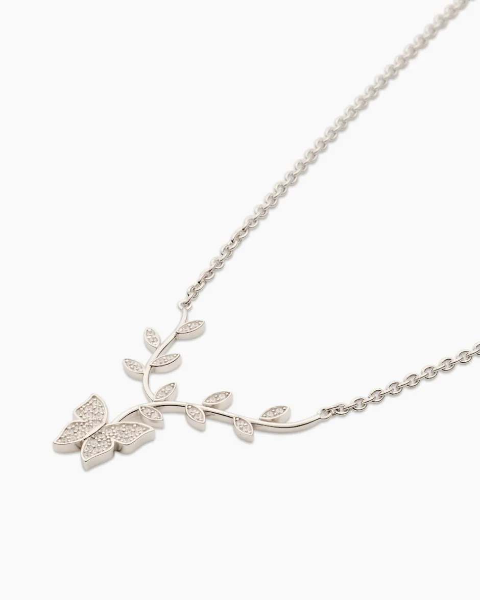 Mit diesem Collier holen Sie sich ein frühlingsfrisches Hingucker-Accessoire für Ihr Dekolleté. Das nicht abnehmbare Motivelement zeigt einen Schmetterling mit zwei Zweiglein und üppigem Zirkonia-Besatz. Insgesamt 46 der weißen Steinchen im Brillantschliff verteilen sich über das Motiv und erzeugen so herrliche Funkelreflexe bei jedem Lichteinfall. Perfekt akzentuiert durch das fantasievolle Kettendesign in feiner Weißgold-Optik.