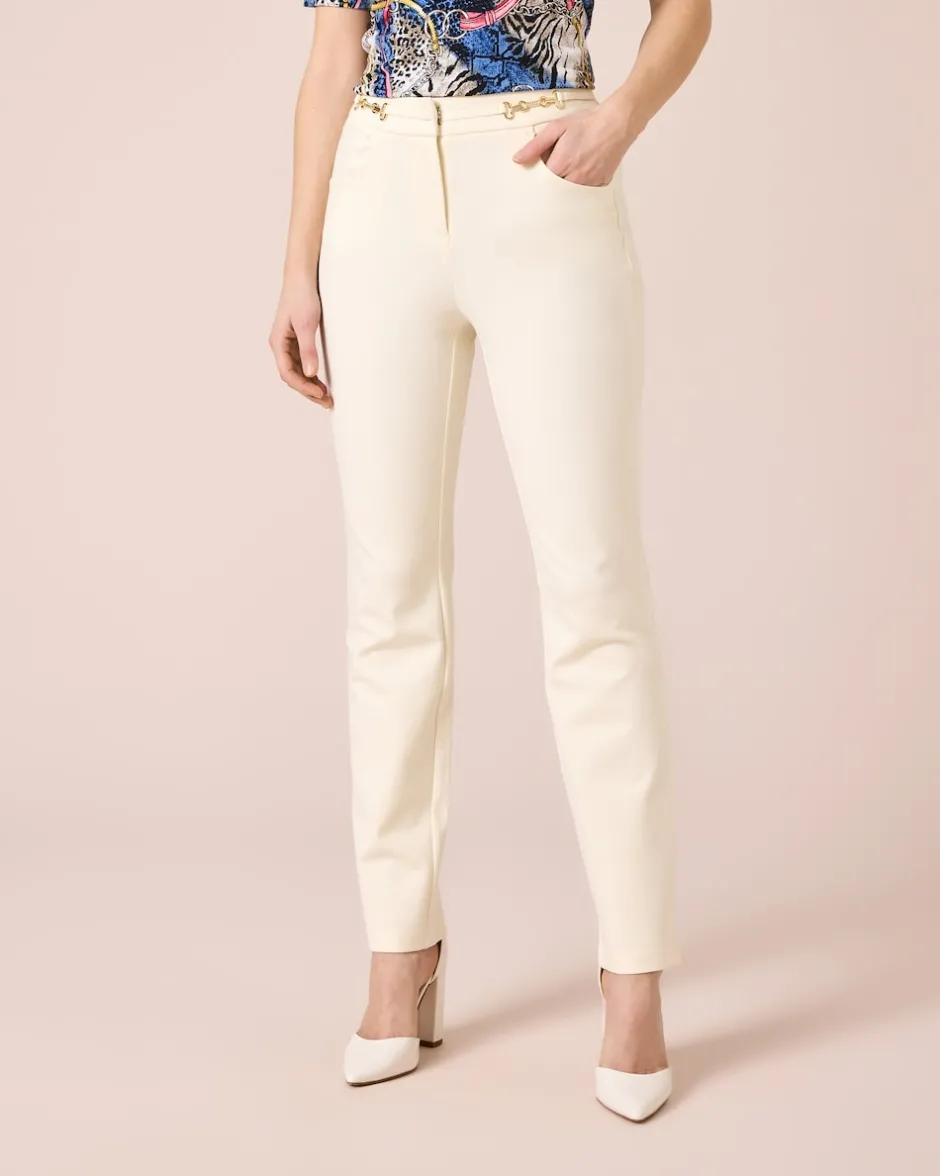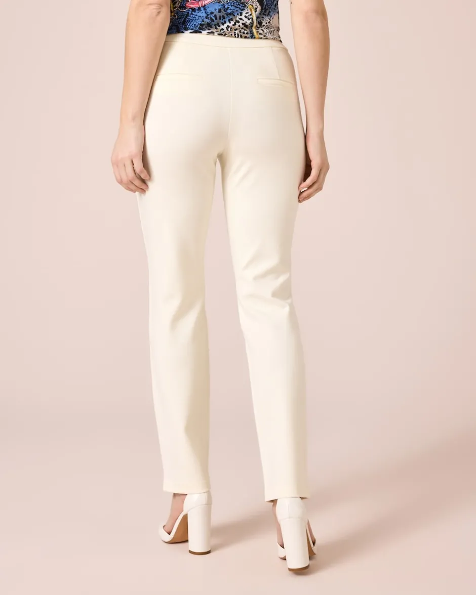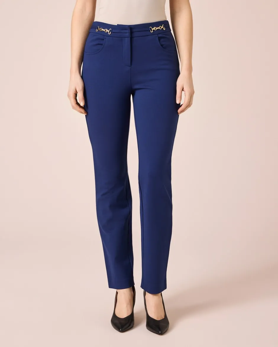Runden Sie jeden Look stilvoll ab mit unserer Hose im schicken Uni-Design. Die edle Metall-Deko am Bund ist ein echter Eye-Catcher. Ein Reißverschluss, der Bund mit Knopf und Haken sowie seitliche Eingriffstaschen und Paspeltaschen auf der Rückseite verbinden Funktionalität mit Stil. Der figurbetonte Schnitt und das gerade Bein schaffen eine schmeichelhafte Silhouette, während die feine Ponte di Roma Qualität tollen Komfort bietet. Ob für den Arbeitsalltag, ein elegantes Dinner oder einen entspannten Nachmittag in der Stadt – diese Hose passt zu jedem Anlass. Kombinieren Sie sie mit einem smarten Blazer und Pumps für einen professionellen Look oder mit einem lockeren Pullover und Sneakern für einen casual Chic.