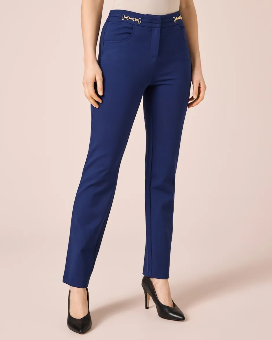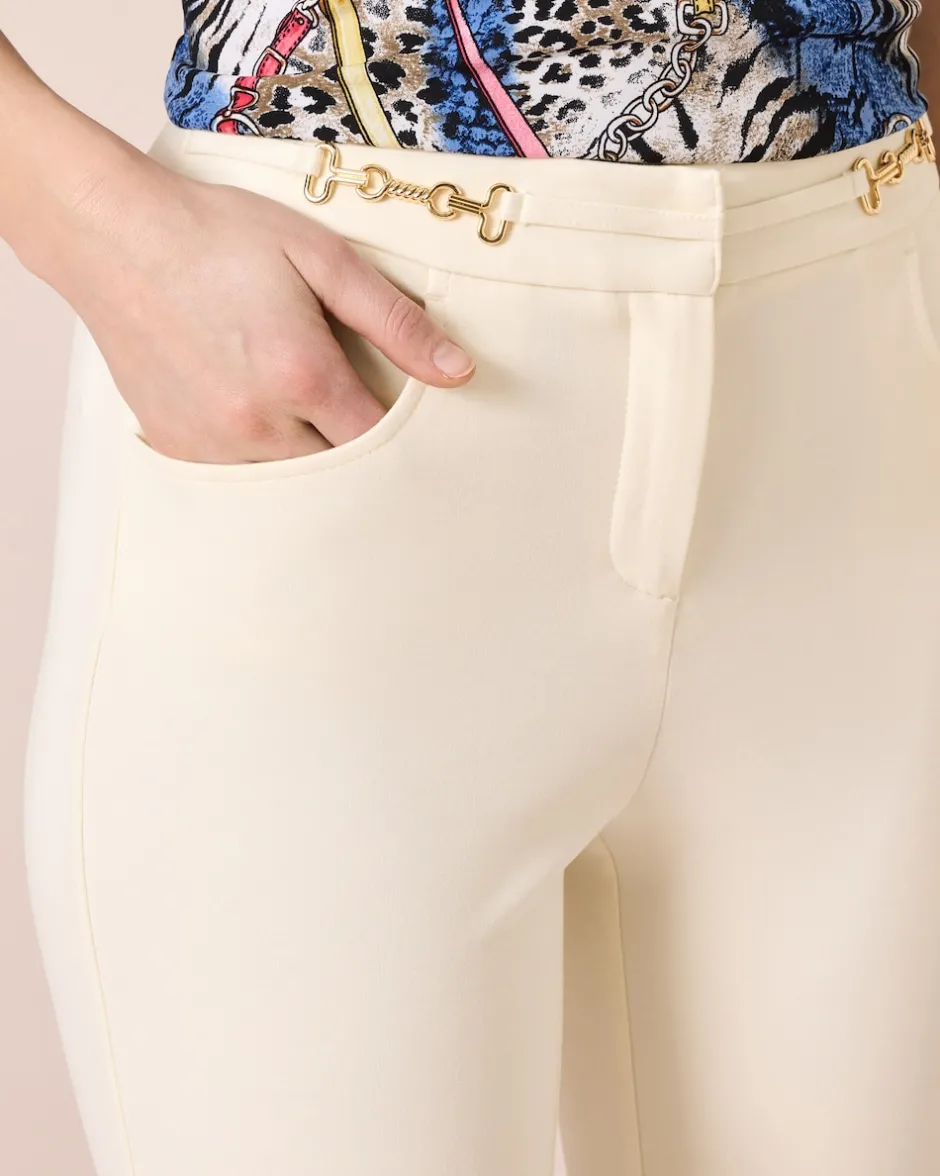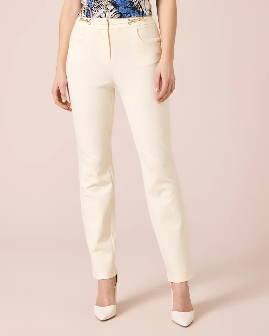 Runden Sie jeden Look stilvoll ab mit unserer Hose im schicken Uni-Design. Die edle Metall-Deko am Bund ist ein echter Eye-Catcher. Ein Reißverschluss, der Bund mit Knopf und Haken sowie seitliche Eingriffstaschen und Paspeltaschen auf der Rückseite verbinden Funktionalität mit Stil. Der figurbetonte Schnitt und das gerade Bein schaffen eine schmeichelhafte Silhouette, während die feine Ponte di Roma Qualität tollen Komfort bietet. Ob für den Arbeitsalltag, ein elegantes Dinner oder einen entspannten Nachmittag in der Stadt – diese Hose passt zu jedem Anlass. Kombinieren Sie sie mit einem smarten Blazer und Pumps für einen professionellen Look oder mit einem lockeren Pullover und Sneakern für einen casual Chic.